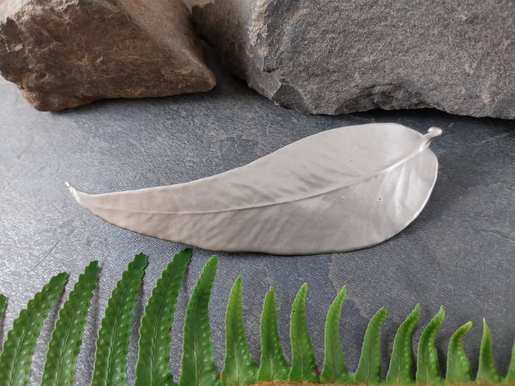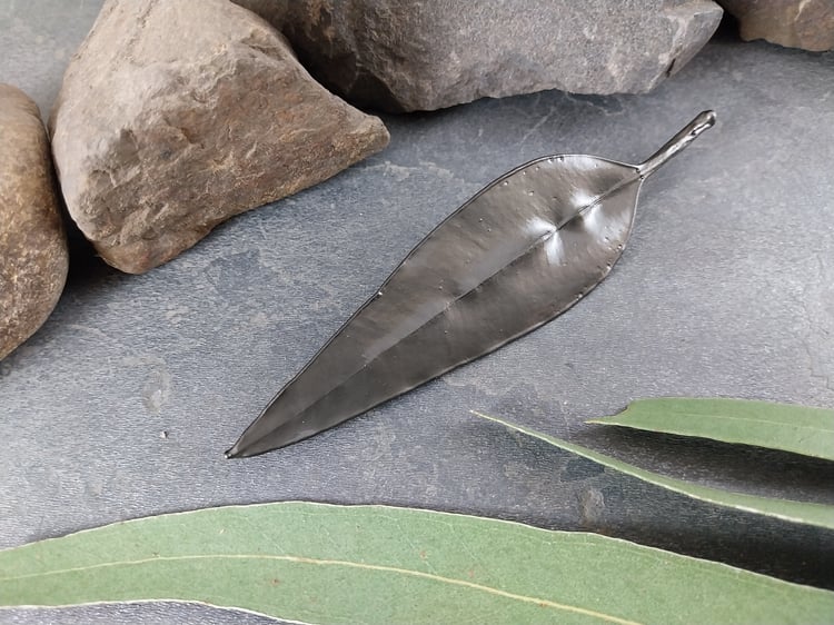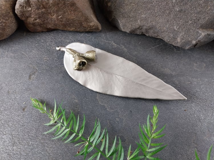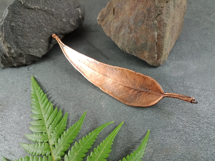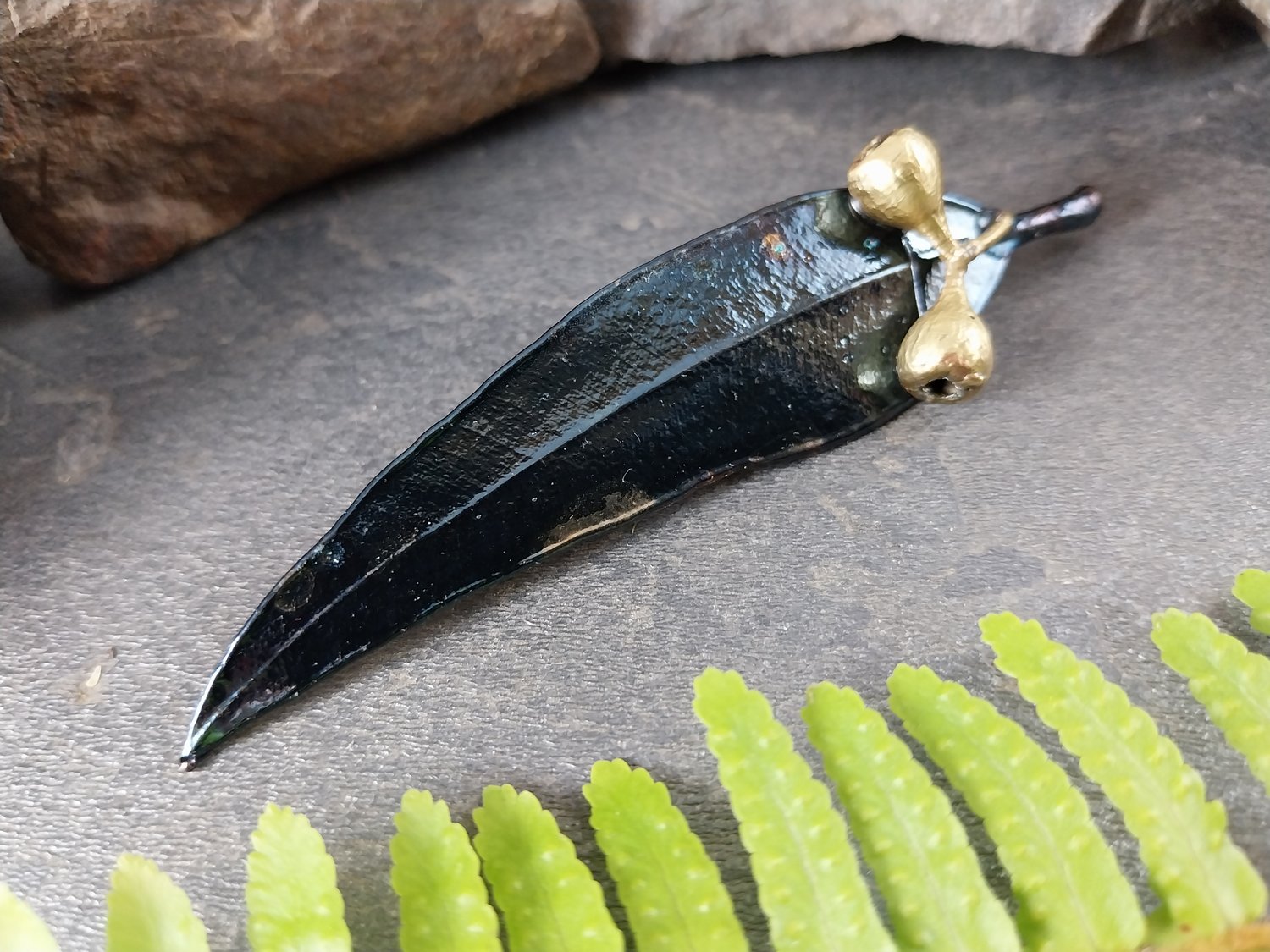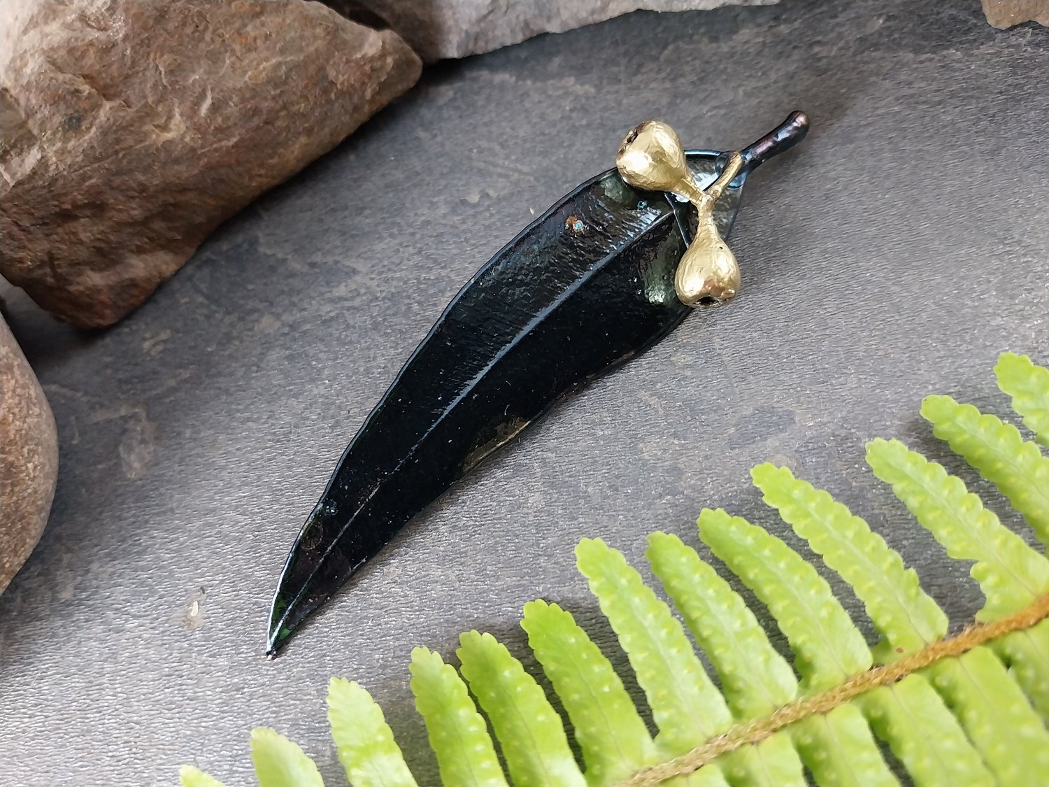 This exquisite brooch features a real natural gum leaf accompanied by a gum nut, preserved forever through the art of electroforming. The delicate textures of the leaf and the organic form of the gum nut are captured in stunning detail, highlighting the beauty of the natural world.