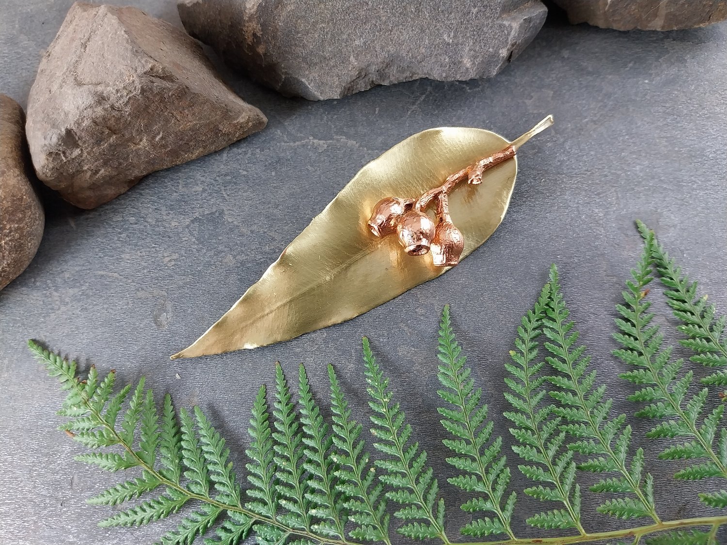 This handcrafted brooch features a genuine natural gum leaf paired with a gum nut cluster, preserved forever through the art of electroforming. The fine details of both elements are beautifully captured, highlighting their organic textures and natural form.