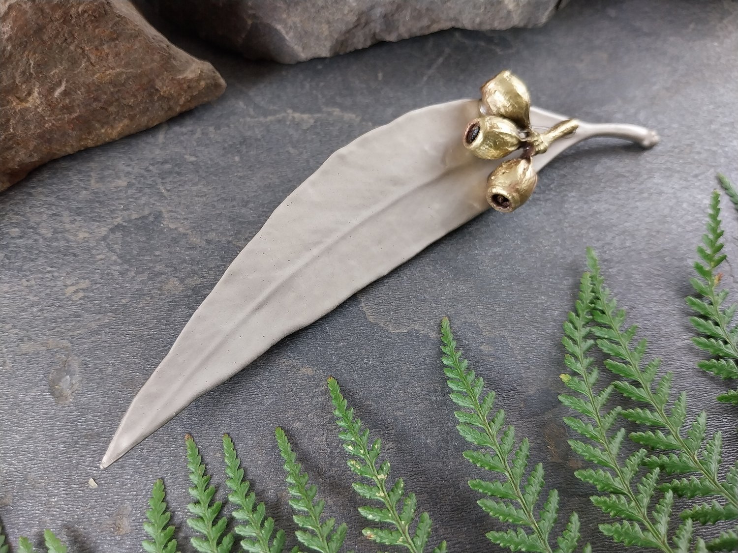This handcrafted brooch features a genuine natural gum leaf paired with a gum nut cluster, preserved forever through the art of electroforming. The intricate textures of both the leaf and nut are beautifully captured, highlighting their natural form and organic charm.