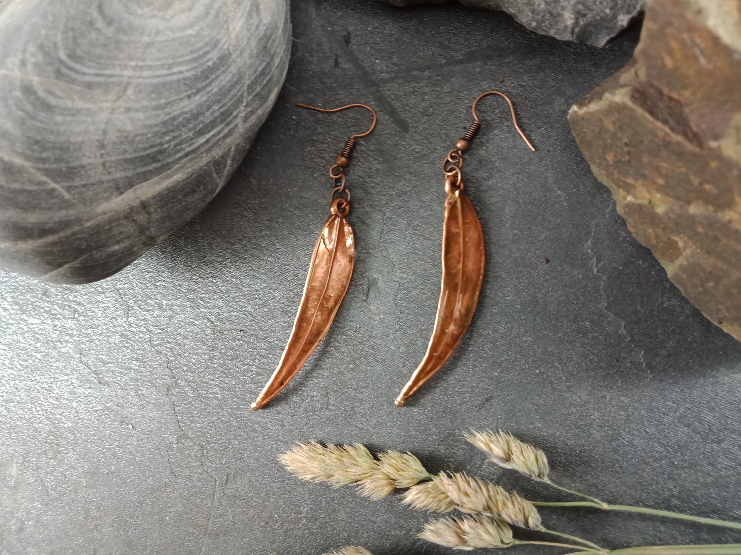 These handcrafted earrings feature genuine natural gum leaves, preserved forever through electroforming in a rustic antique copper finish. Each leaf retains its unique veins and textures, capturing the essence of nature in lasting beauty.
