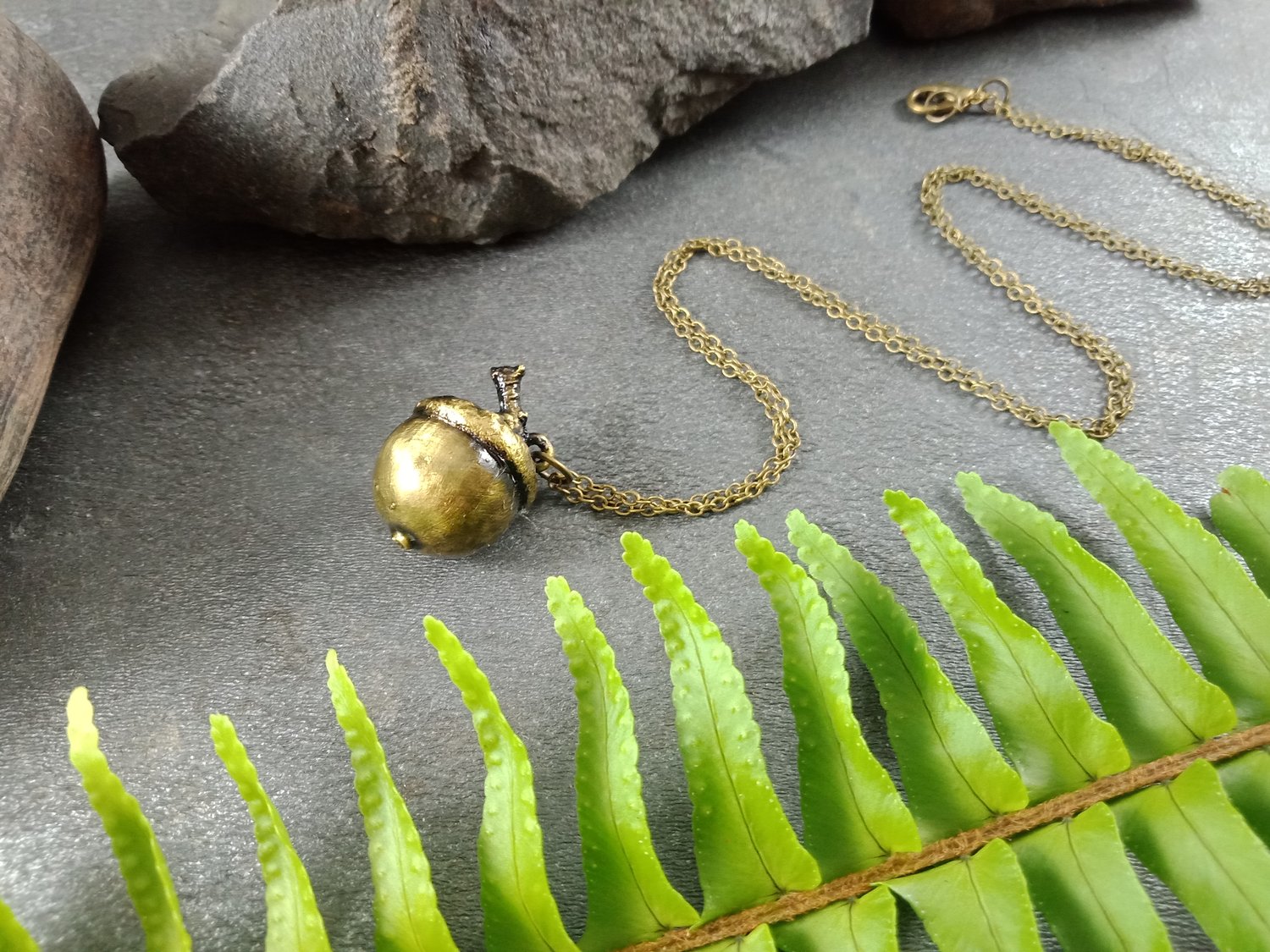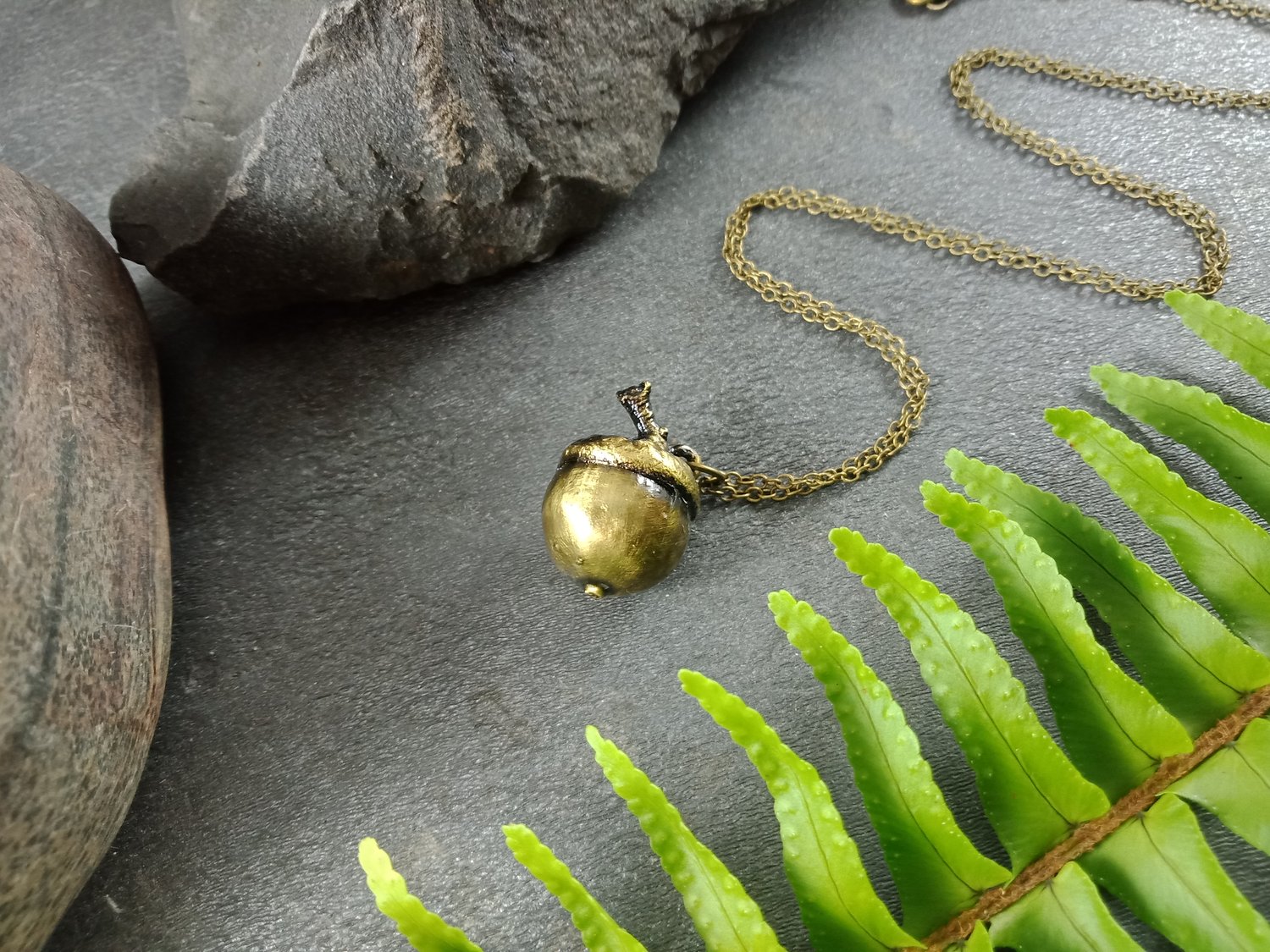 This handcrafted Acorn Pendant features a genuine natural acorn, preserved through electroforming to capture its organic texture and form in exquisite detail.