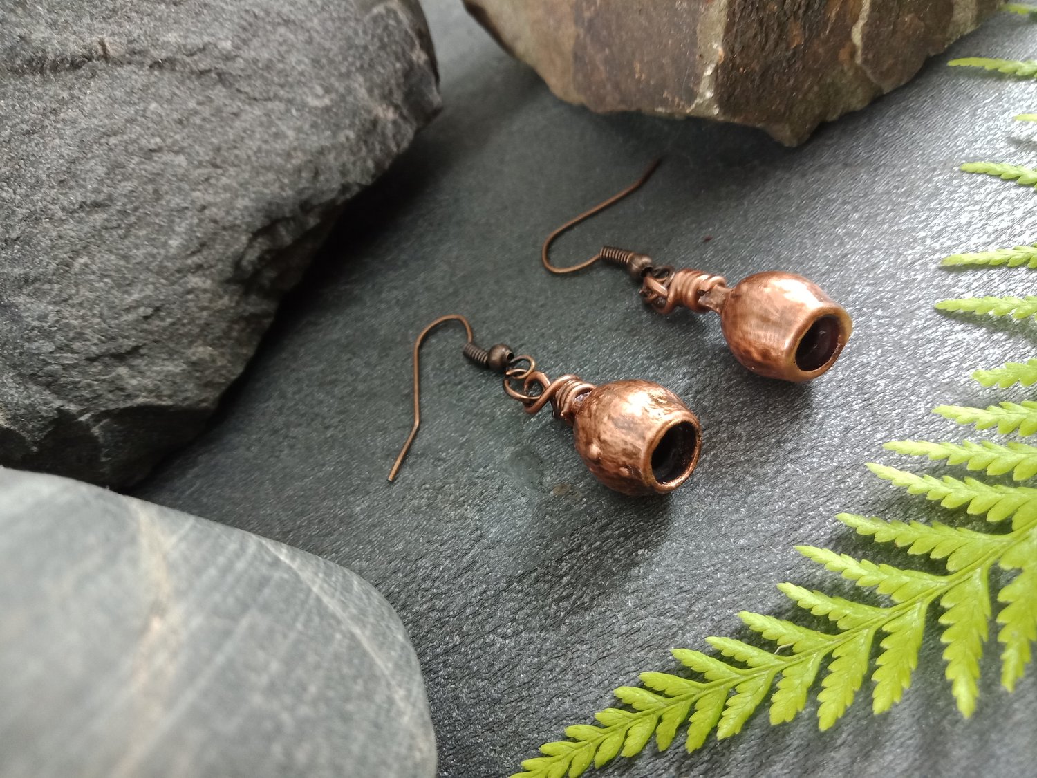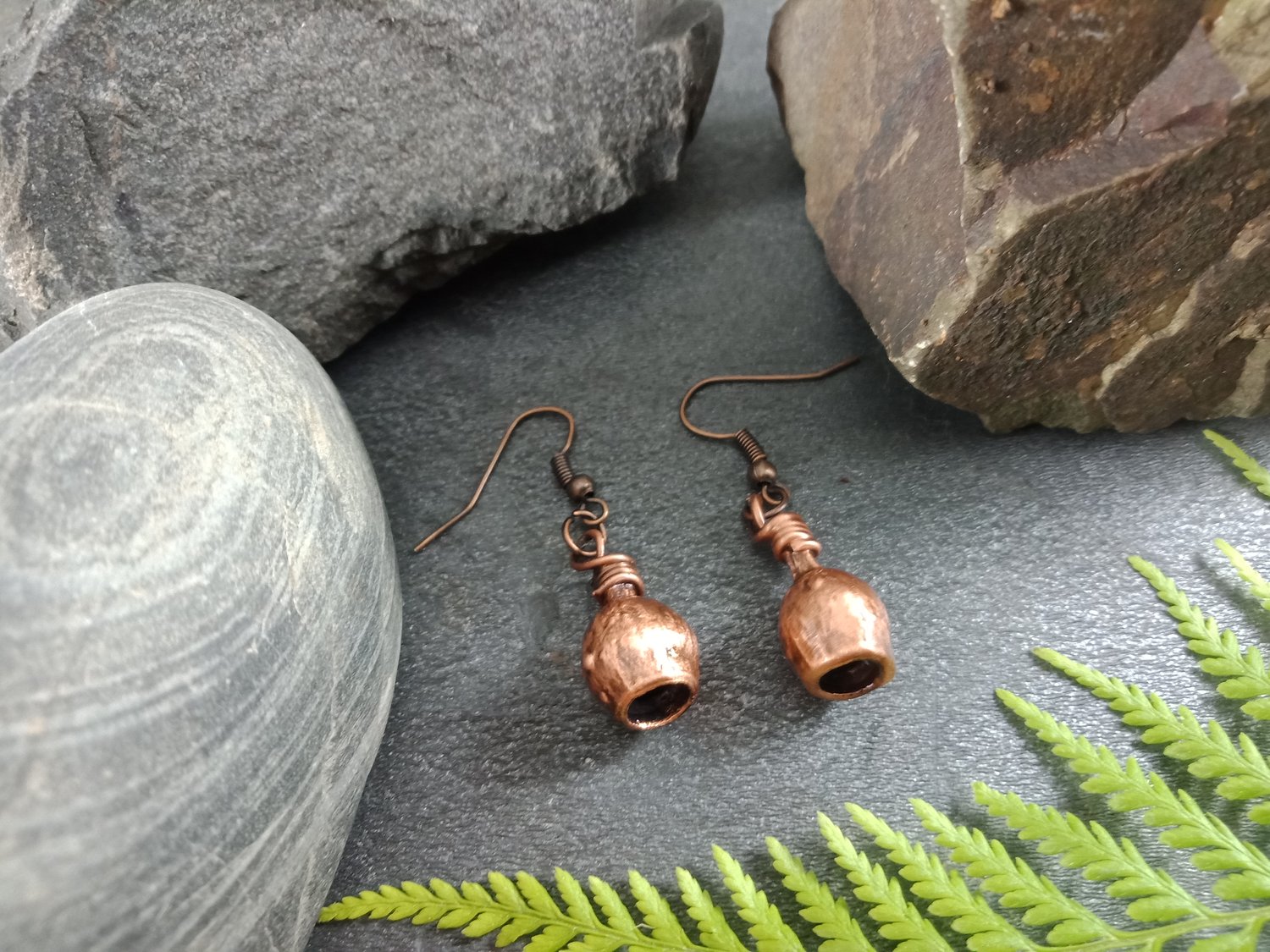Finished in rustic antique copper, the earrings carry a warm, earthy metallic sheen that enhances their natural beauty. At 18mm, they are a delicate yet striking accessory—perfect for everyday wear or as a one-of-a-kind, nature-inspired gift.