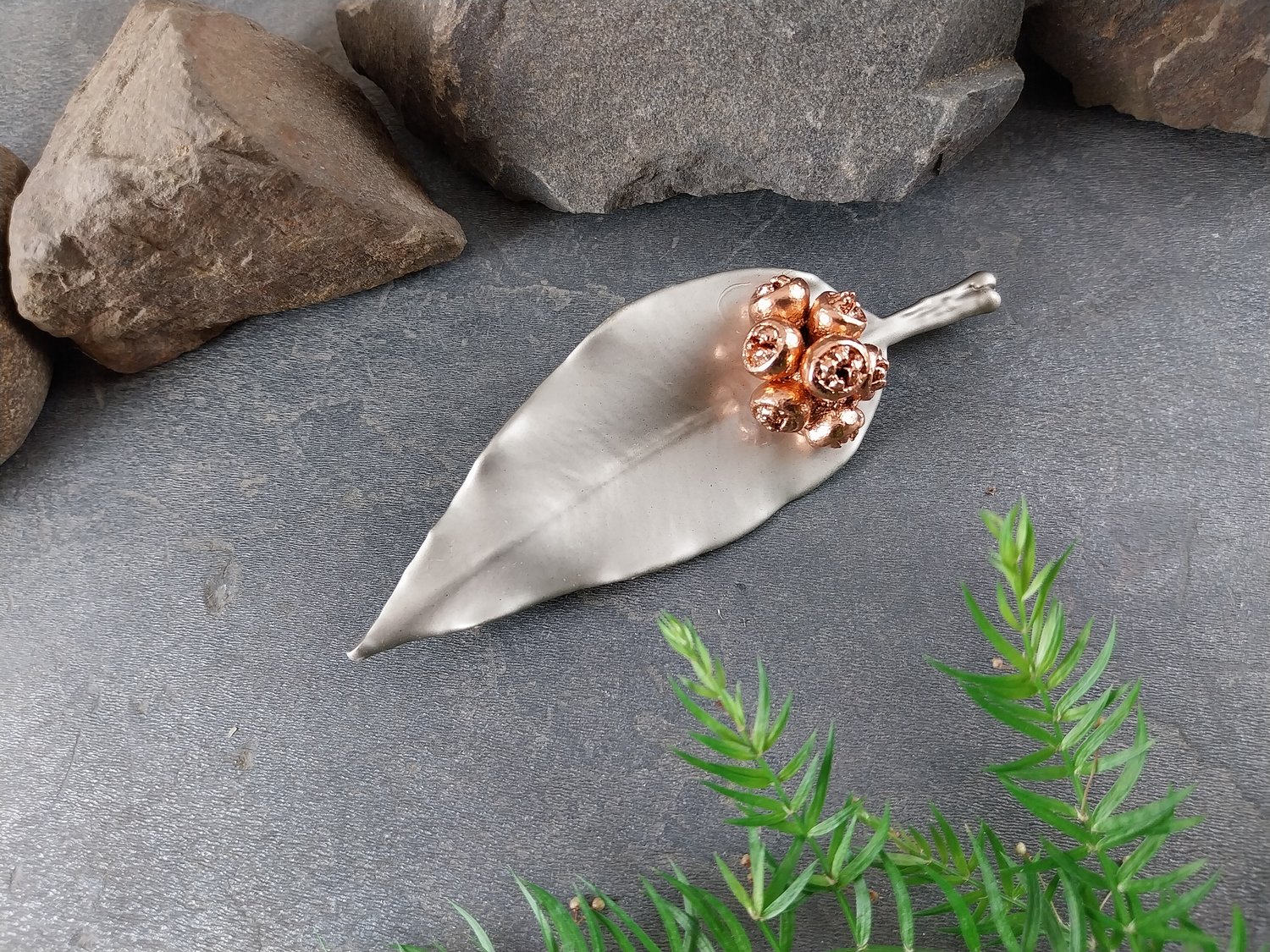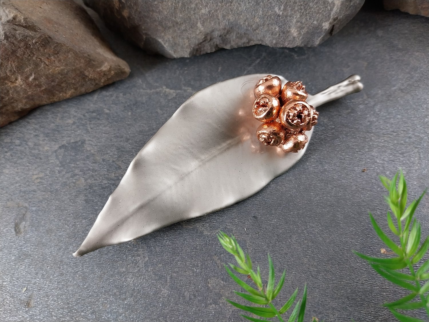 This handcrafted brooch features a genuine gum leaf and gum nut cluster, preserved forever through the art of electroforming. Each natural detail is beautifully captured, celebrating the organic textures and forms of Australian flora.