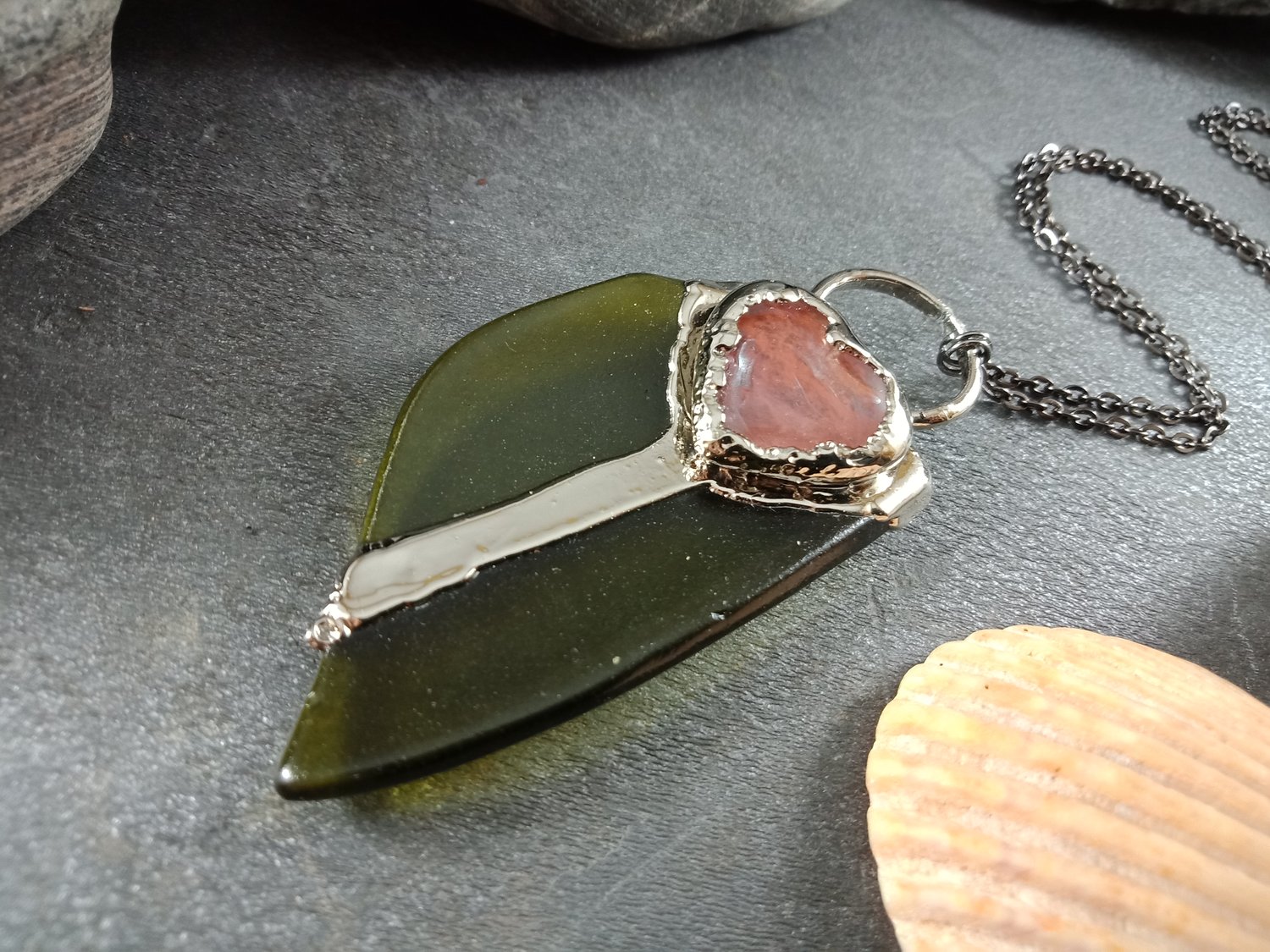 Sea Glass & Carnelian Heart Pendant – Bright Nickel (75mm)