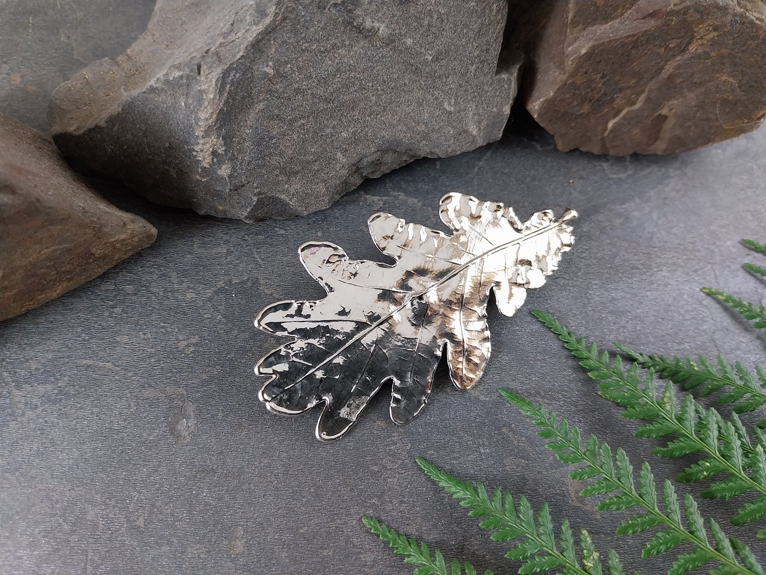 This handcrafted Oak Leaf Brooch features a genuine natural oak leaf, carefully preserved through electroforming to capture its delicate veins and organic shape in lasting detail.