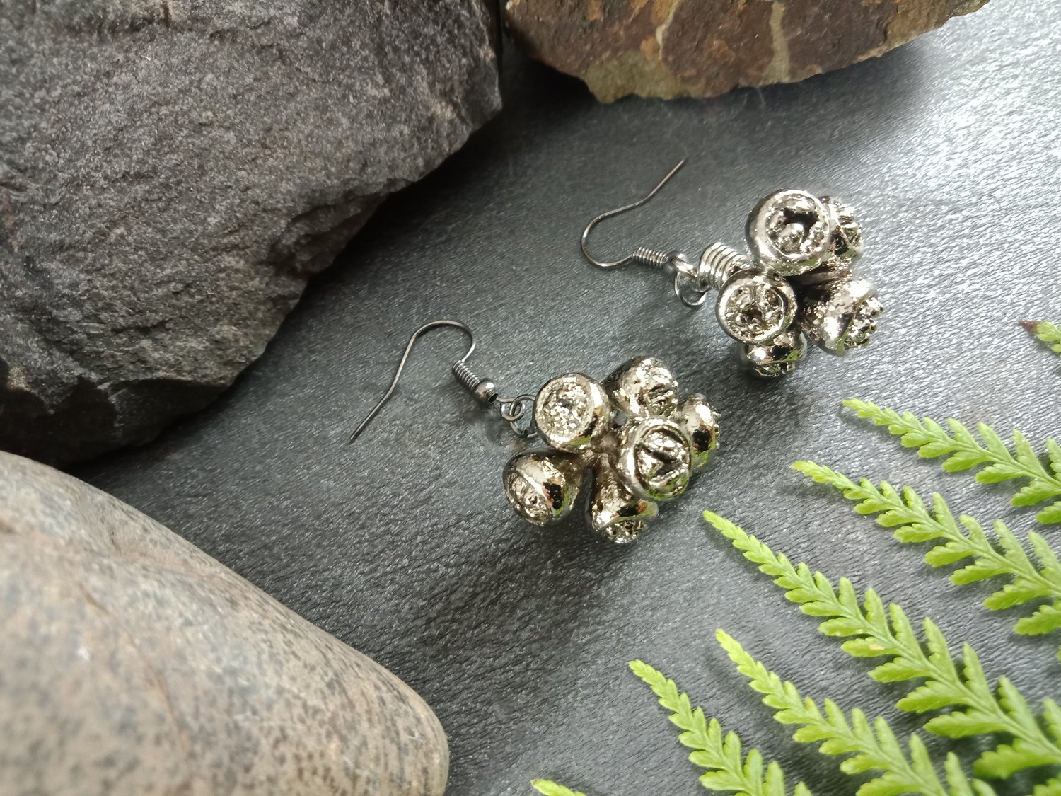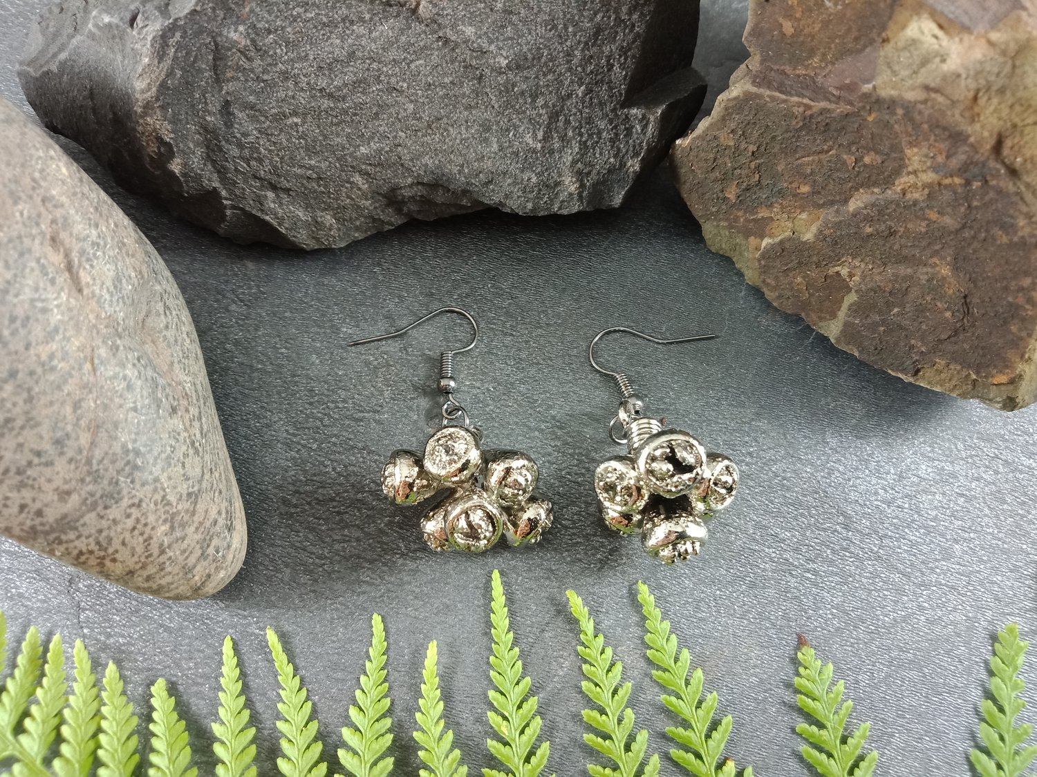 These handcrafted earrings feature genuine natural gum nut clusters, preserved forever through the art of electroforming. Every tiny detail of the nuts is captured, highlighting the organic beauty of Australian flora.