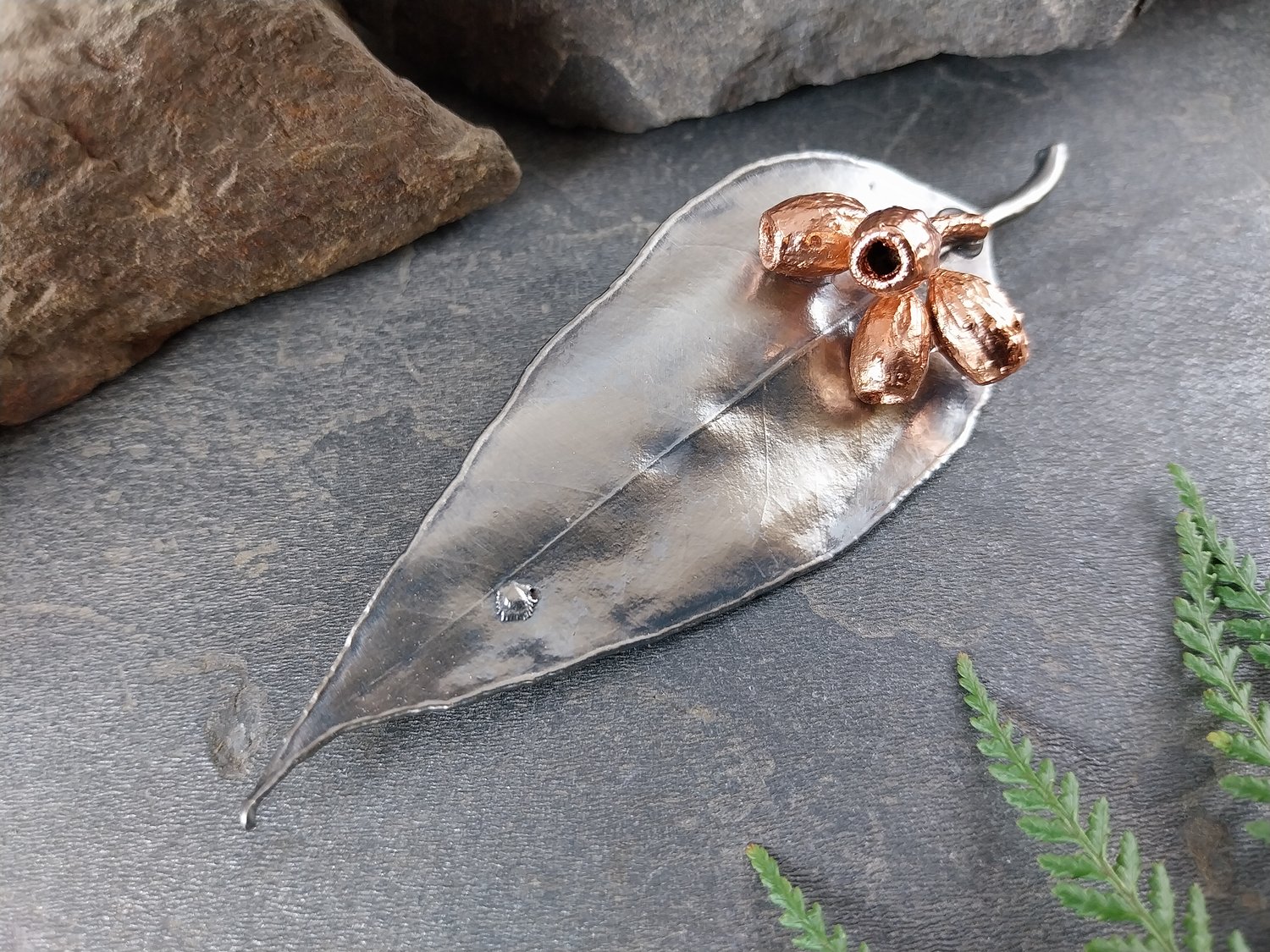 This handcrafted brooch features a genuine natural gum leaf paired with a gum nut cluster, preserved forever through the art of electroforming. The intricate textures of both elements are beautifully captured, highlighting the natural beauty of Australian flora.