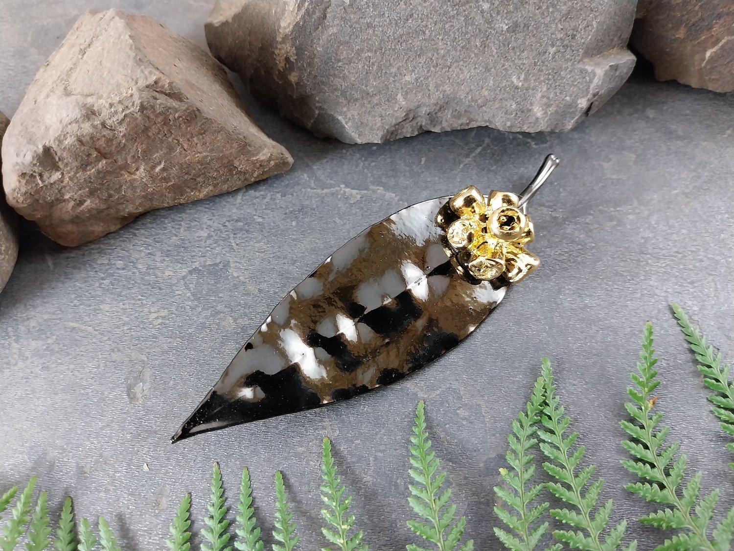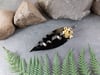 This beautiful brooch features a real Australian gum leaf and gum nut, preserved forever through the art of electroforming. The natural textures are highlighted with a striking bright graphite and gold finish, creating a bold yet elegant contrast.
