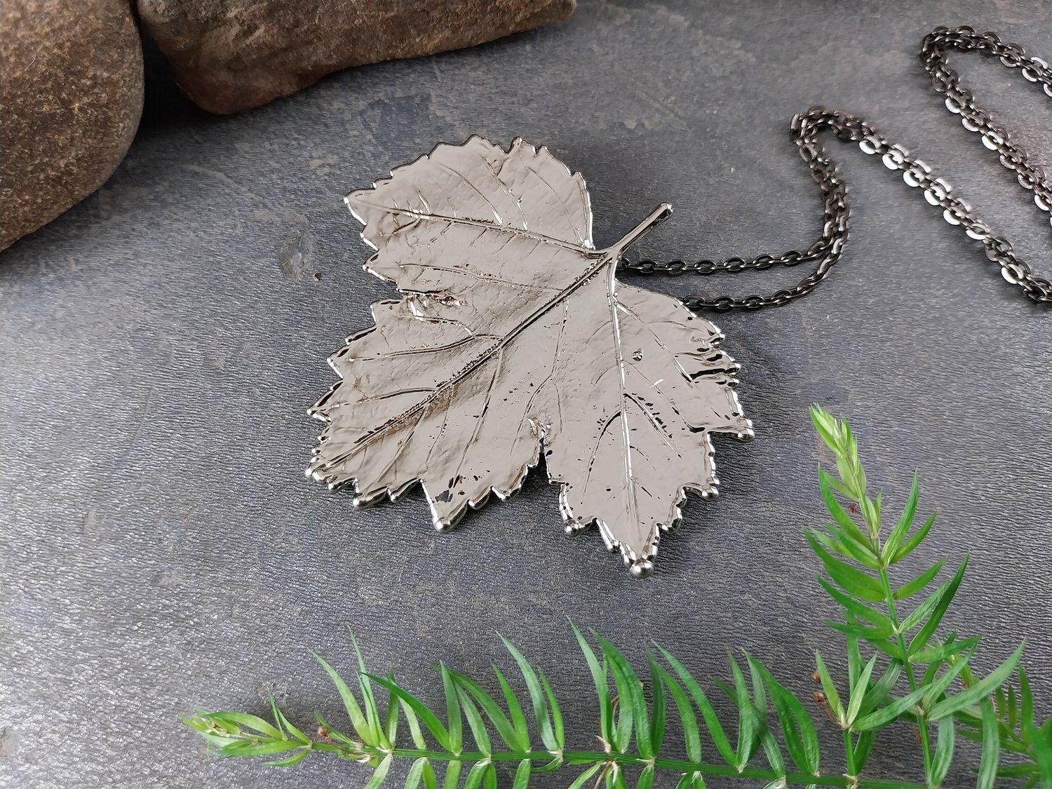 Finished in luminous bright nickel, the pendant carries a sleek, radiant metallic sheen that enhances the textures and details of the leaf. At 50mm, it is a versatile and wearable piece—perfect for everyday wear or as a unique, nature-inspired gift.