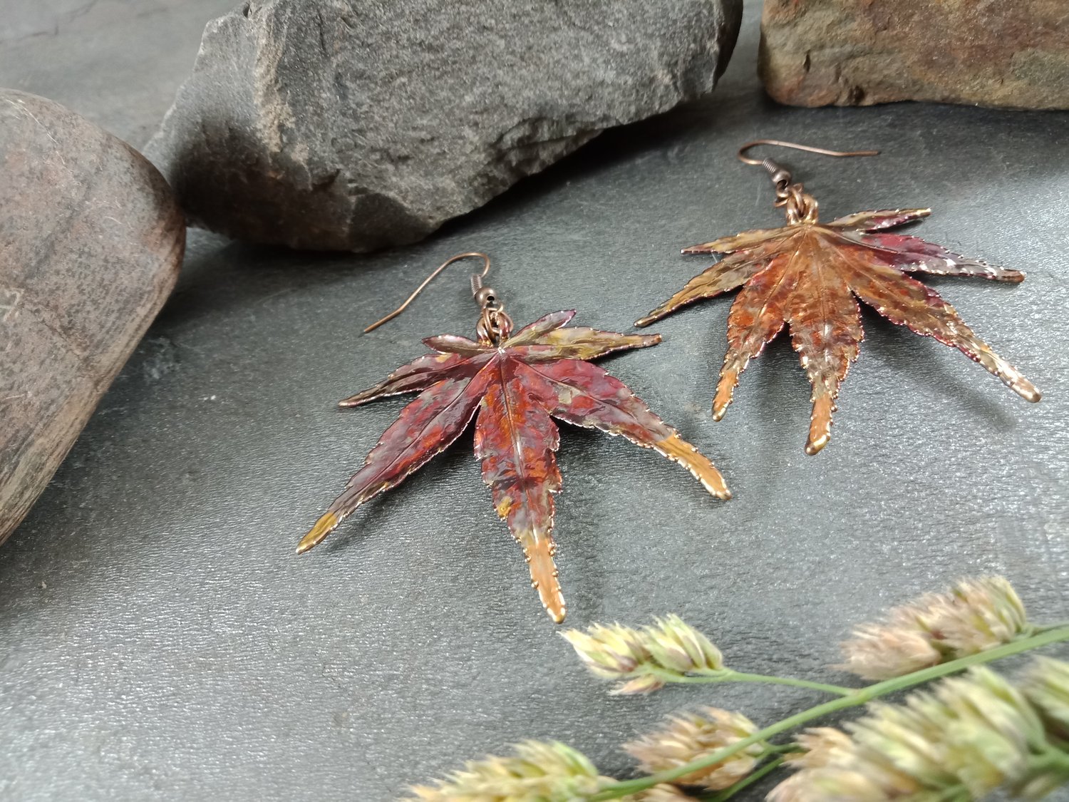 These handcrafted Japanese Maple Leaf Earrings feature genuine natural maple leaves, preserved through electroforming to capture their delicate shapes and intricate vein patterns in lasting detail.