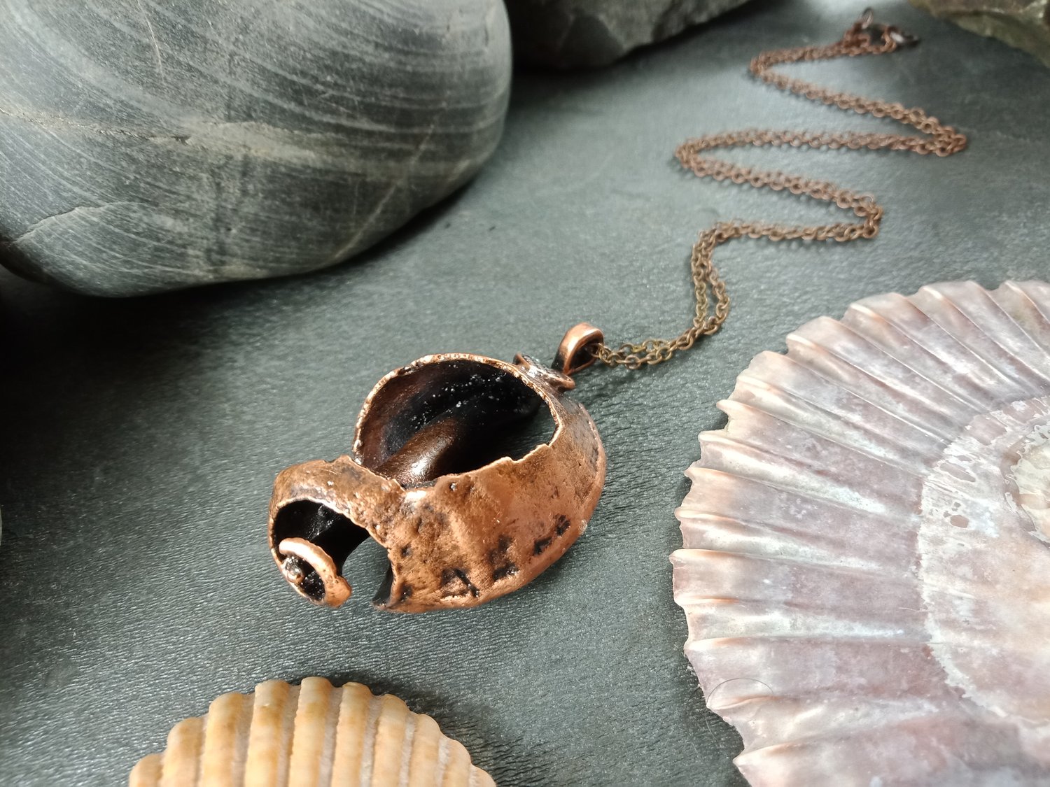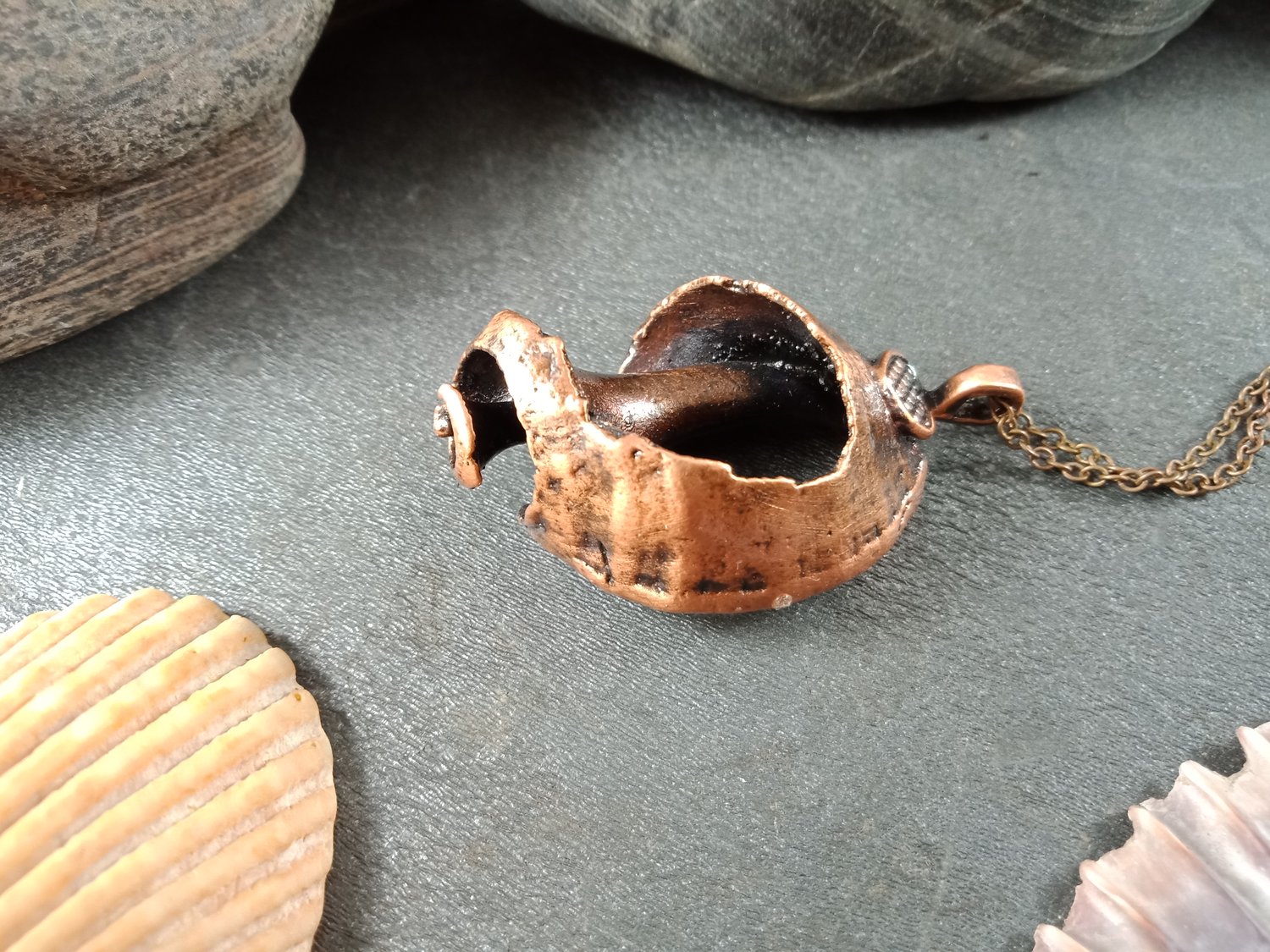 Finished in rustic antique copper, the pendant carries a warm, earthy patina that enhances the natural charm of the shell. At 44mm, it is a striking yet wearable piece—perfect for everyday wear or as a distinctive nature-inspired gift.
