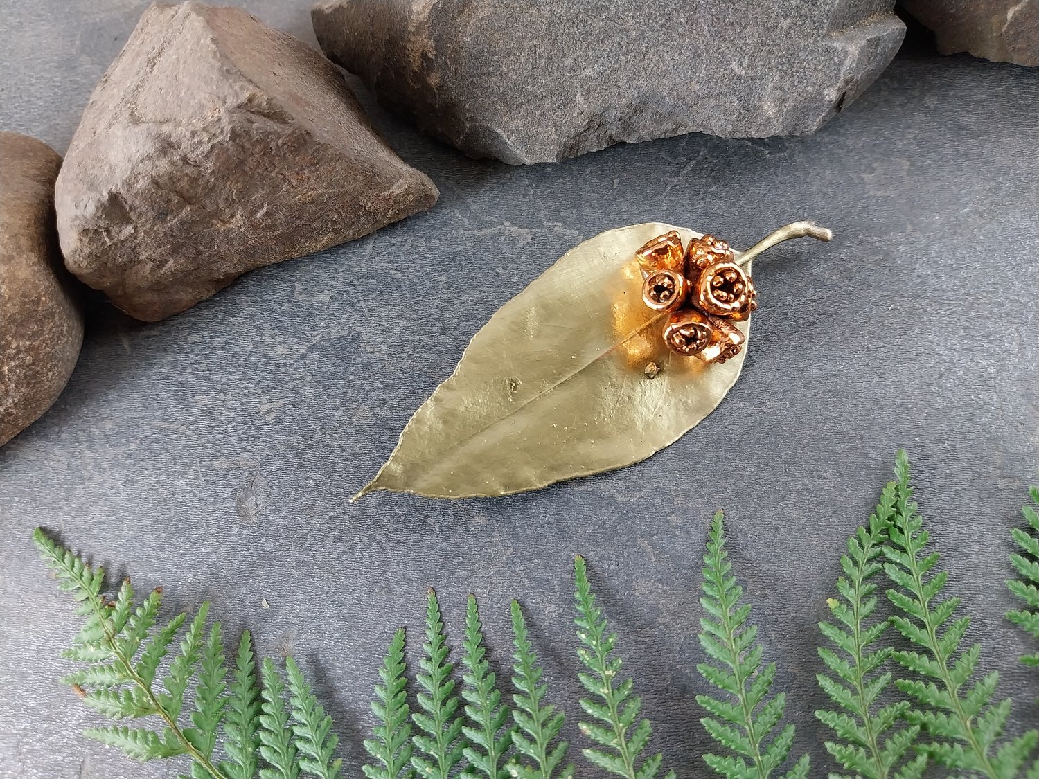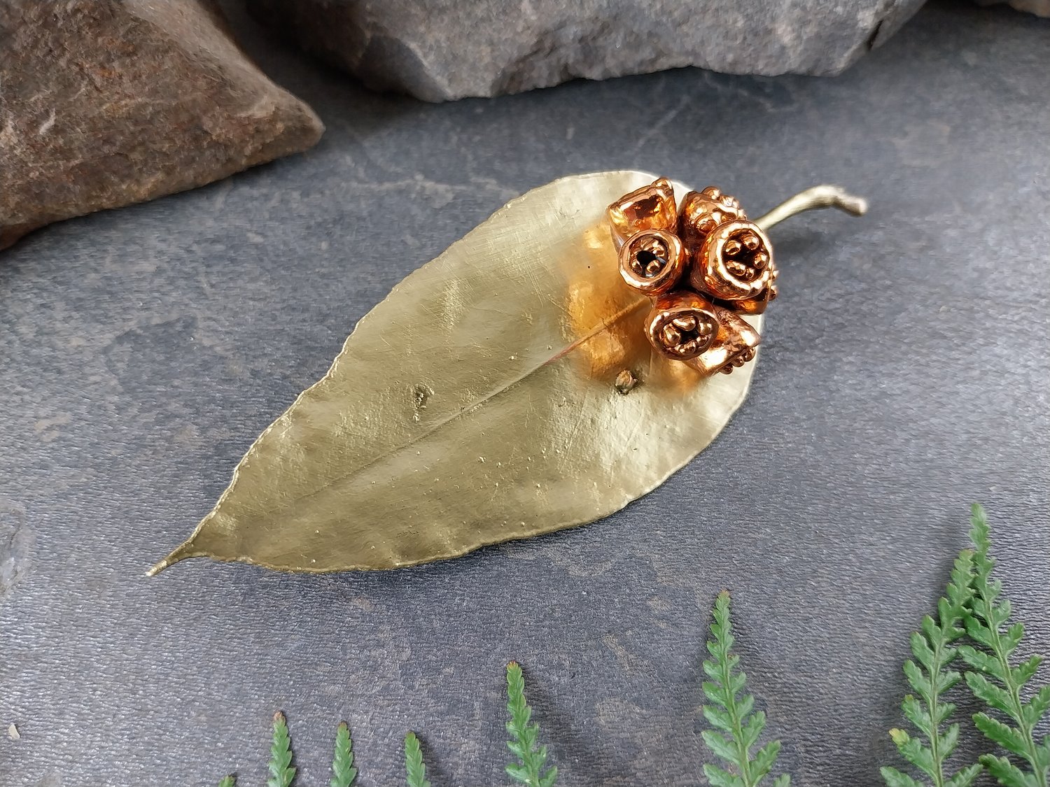 This handcrafted brooch features a genuine natural gum leaf paired with a gum nut cluster, preserved forever through the art of electroforming. The organic textures of the leaf and nut are beautifully highlighted, capturing the essence of the Australian bush.