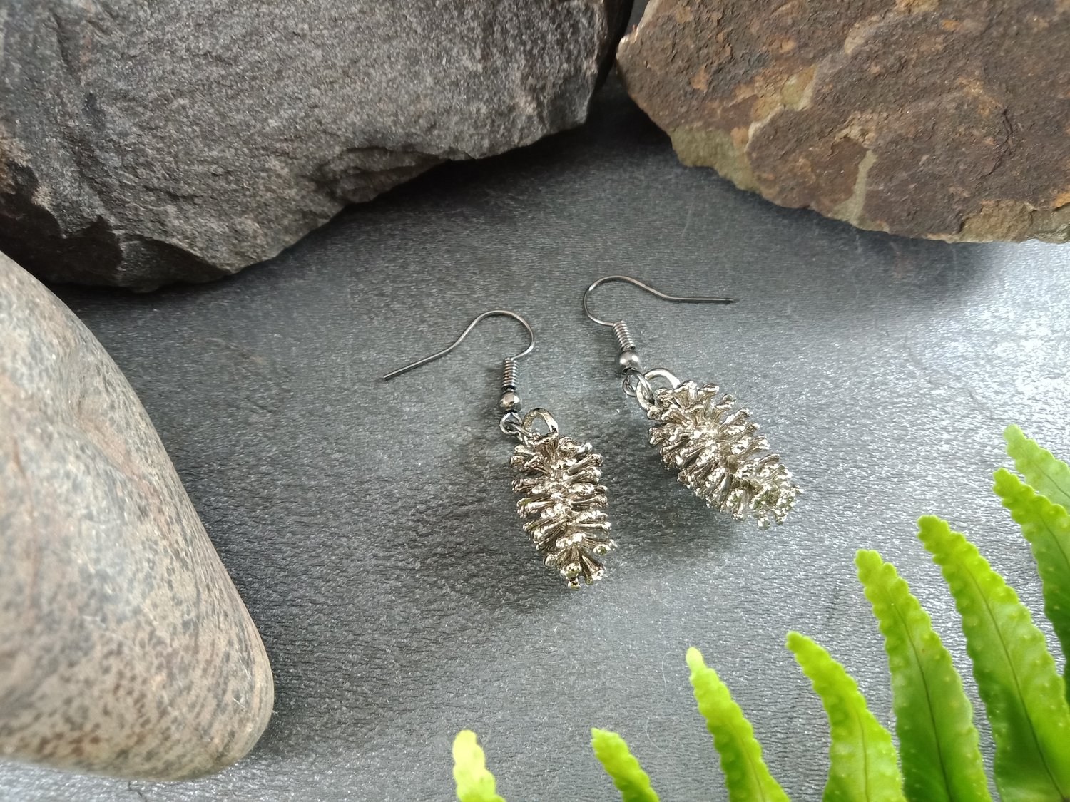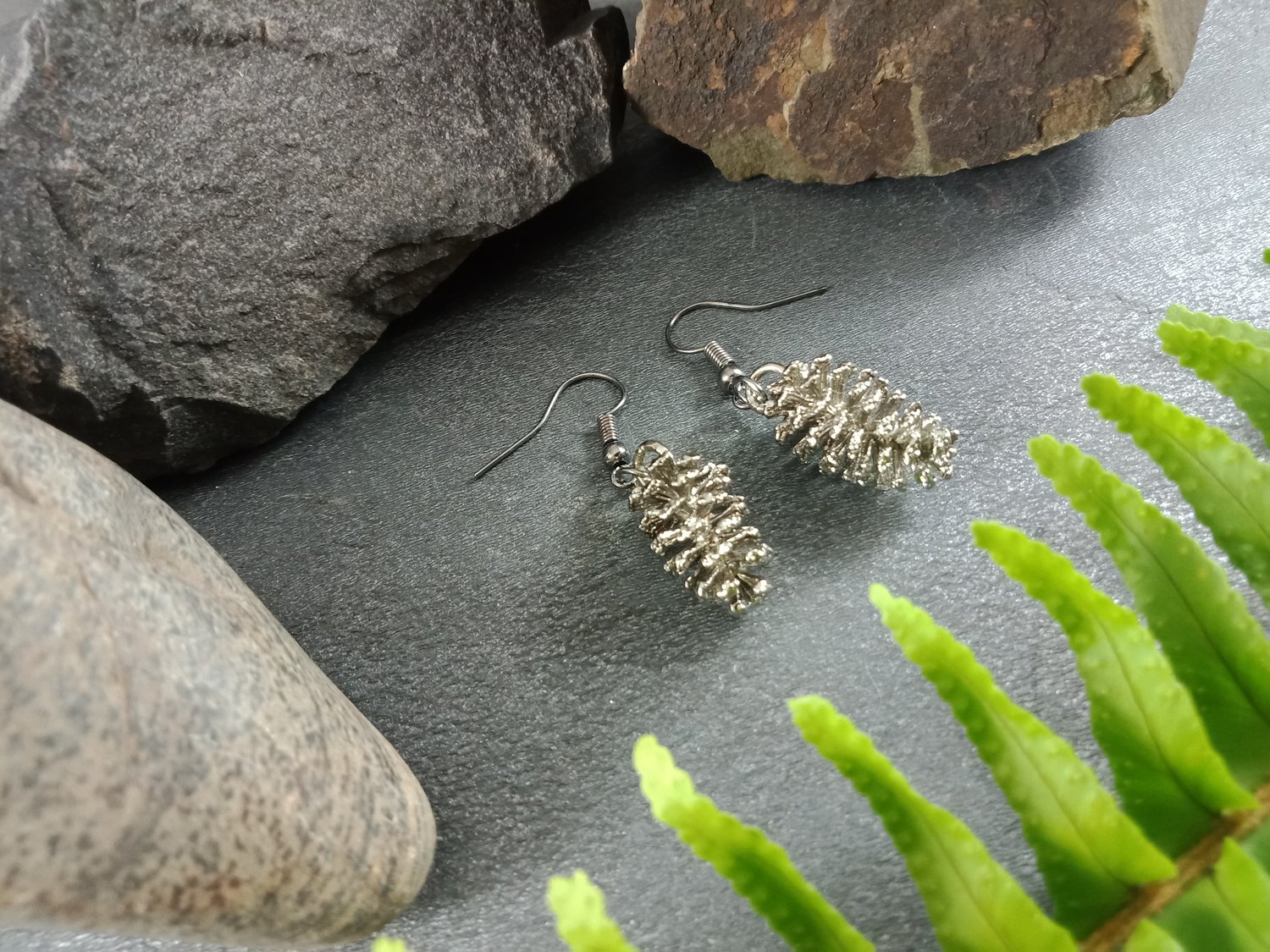 Finished in radiant bright nickel, the earrings gleam with a sleek, polished shine that highlights the organic charm of the cones. At 20mm, they are perfectly sized for everyday wear—lightweight, unique, and full of nature-inspired elegance.