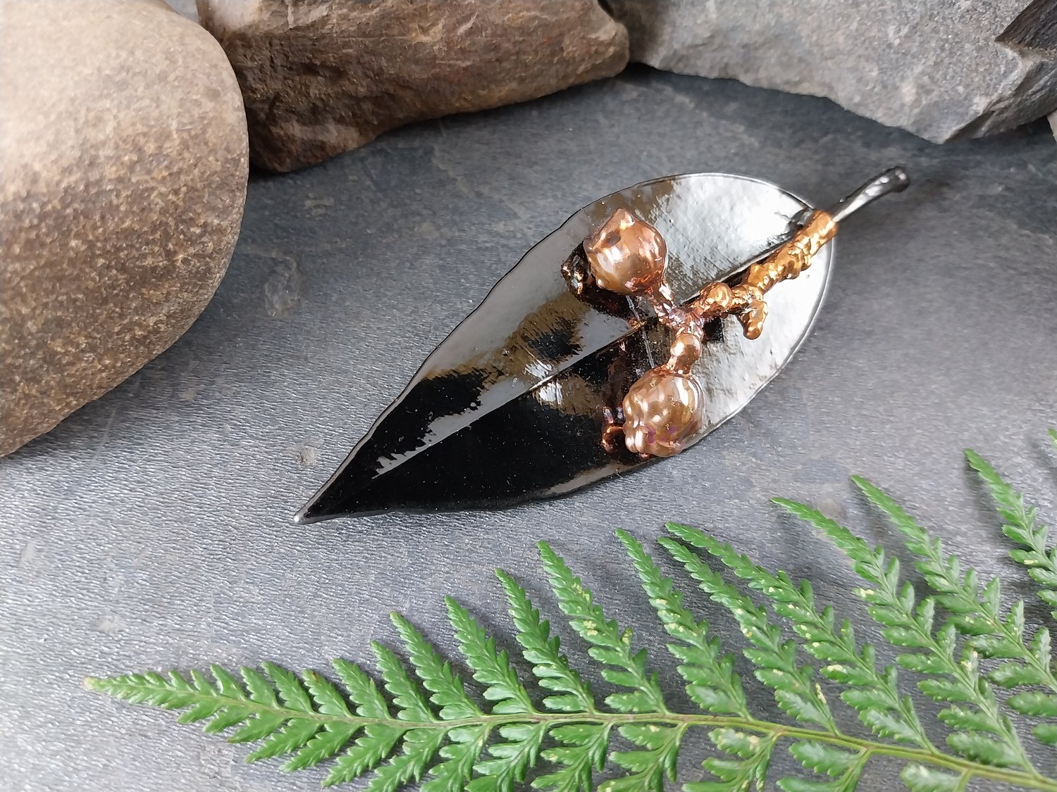 Gum Leaf / Gum Nut Brooch – Bright Graphite / Rainbow Copper Patina (100mm)
