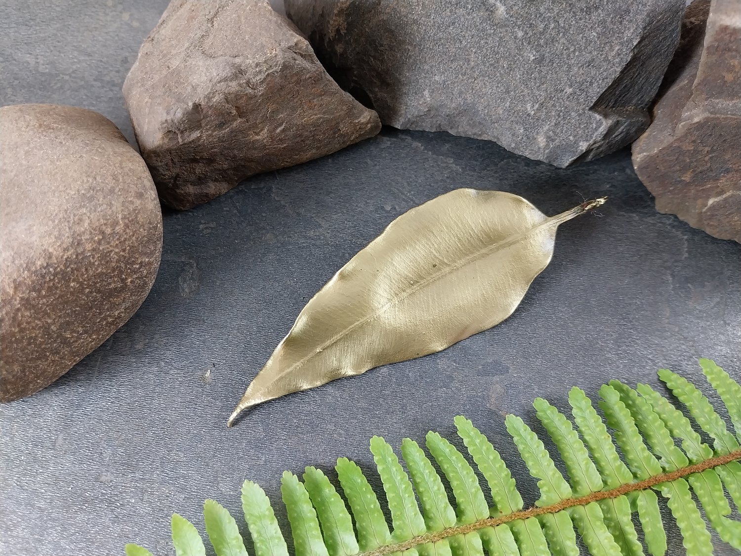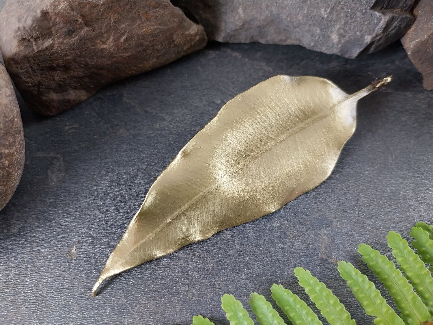 This elegant brooch features a real natural gum leaf, preserved forever through the art of electroforming. The fine details of the leaf’s veins and textures are beautifully highlighted, capturing the essence of nature in wearable form.