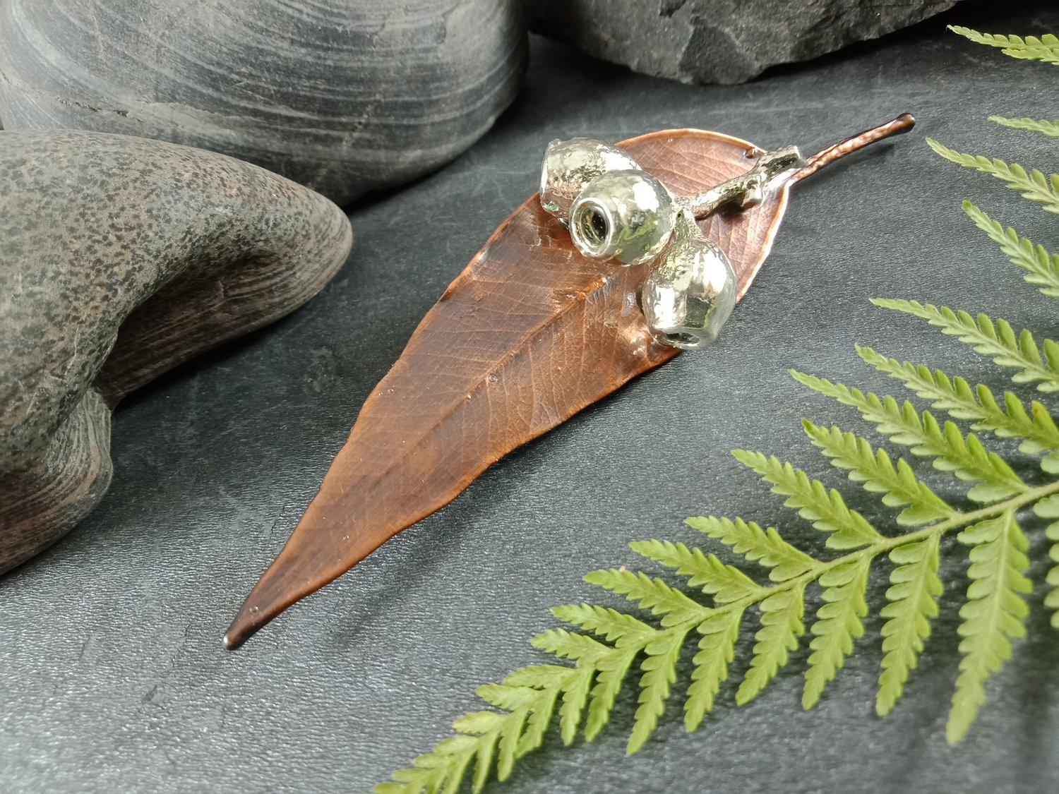 This handcrafted brooch features a genuine natural Australian gum leaf, preserved forever through electroforming in a warm, rustic antique copper finish. Accented with a trio of gum nuts in a striking silver finish, the design beautifully contrasts metallic tones while highlighting the intricate natural textures.