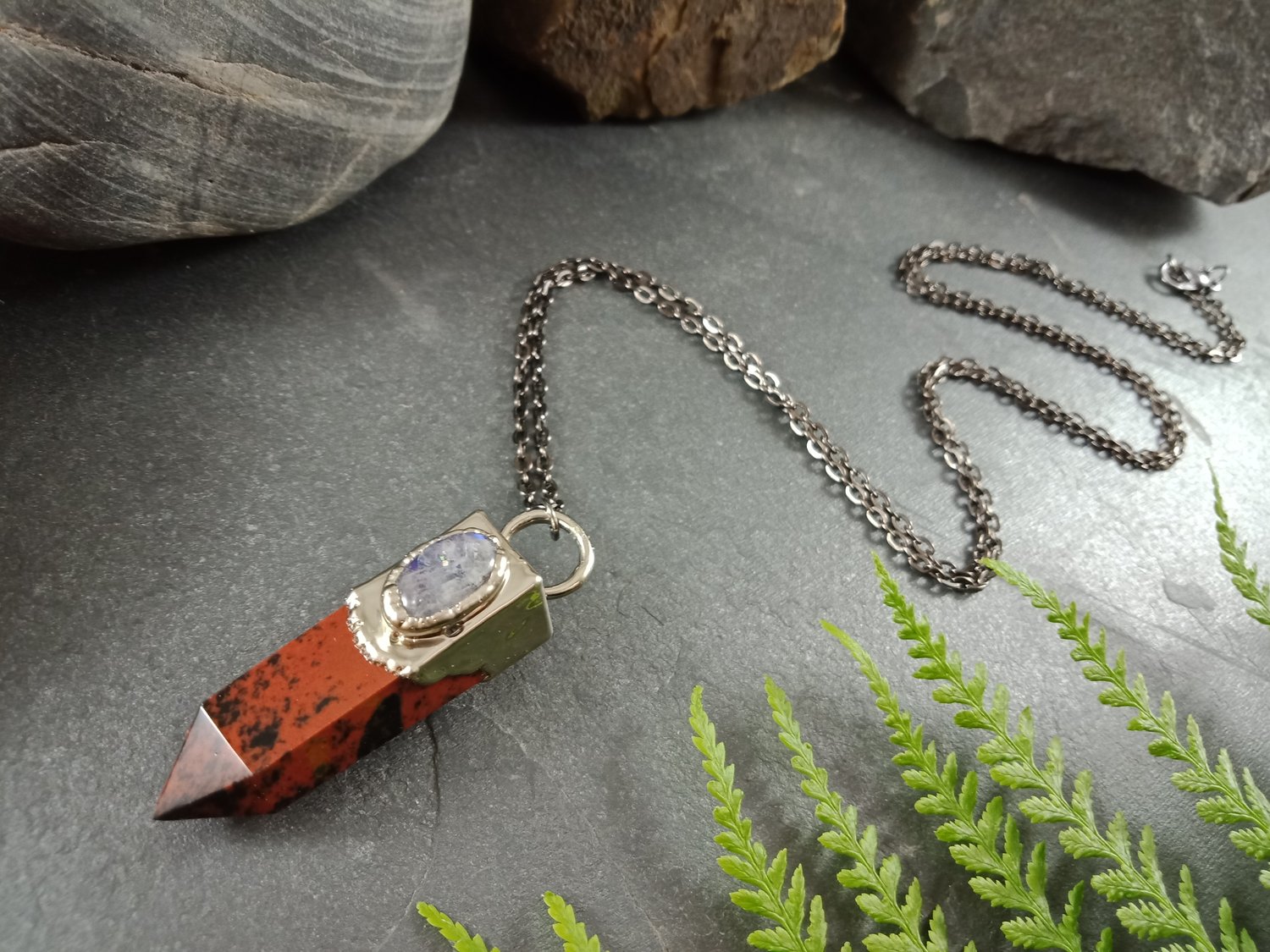 This handcrafted Mahogany Obsidian & Moonstone Pendant pairs the grounding beauty of natural stone with the luminous glow of moonstone. A genuine mahogany obsidian crystal point forms the base, rich with warm earthy tones, while an oval blue fire moonstone cabochon shimmers above with flashes of iridescent light.