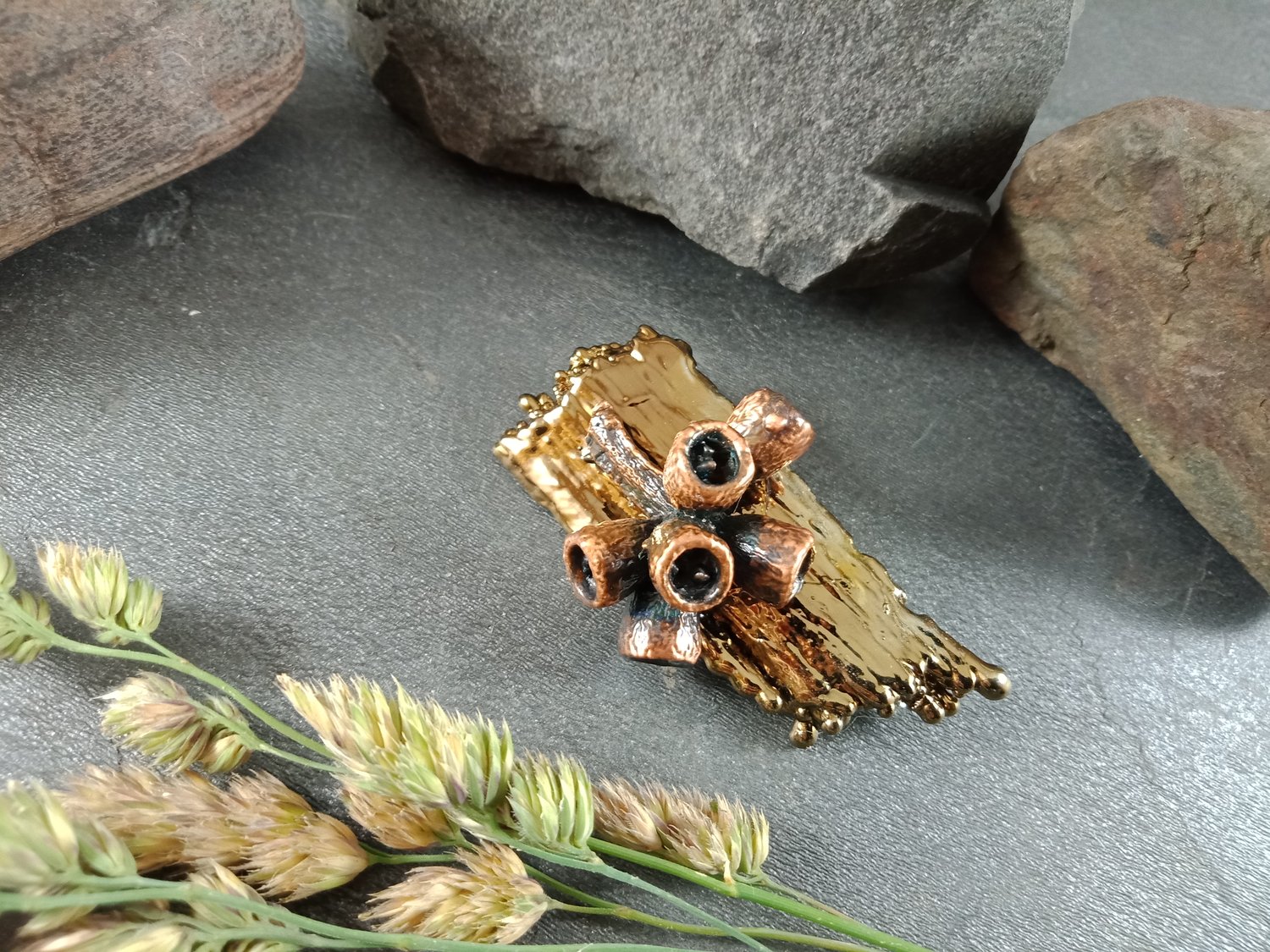 This handcrafted brooch features a genuine gum nut cluster paired with a portion of natural gum tree bark, preserved forever through the art of electroforming. Every texture and detail of these authentic natural elements is captured in lasting beauty, highlighting the rugged charm of the Australian bush.
