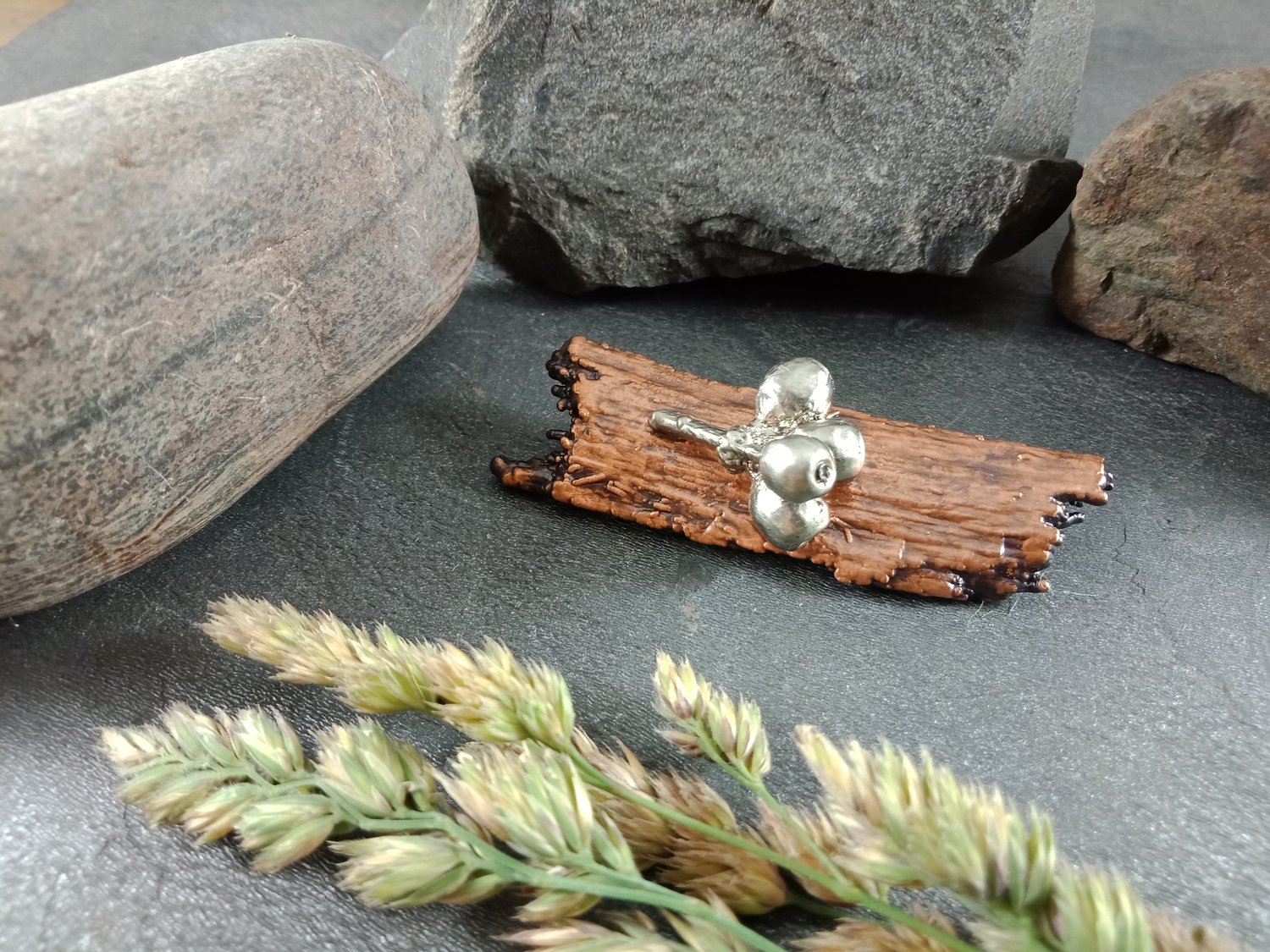 This handcrafted brooch features a genuine gum nut cluster paired with a portion of natural gum tree bark, preserved forever through the art of electroforming. Every ridge and texture of these Australian bush elements is captured in lasting detail, celebrating their raw beauty.
