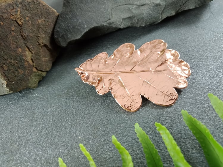 This beautiful brooch features a real natural oak leaf, preserved forever through the art of electroforming. The fine veins and natural textures of the leaf are captured in striking detail, showcasing the elegance of nature’s design.