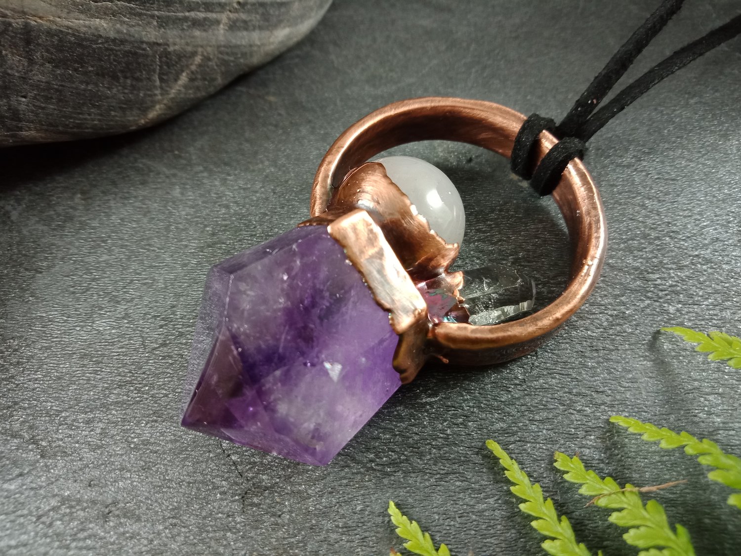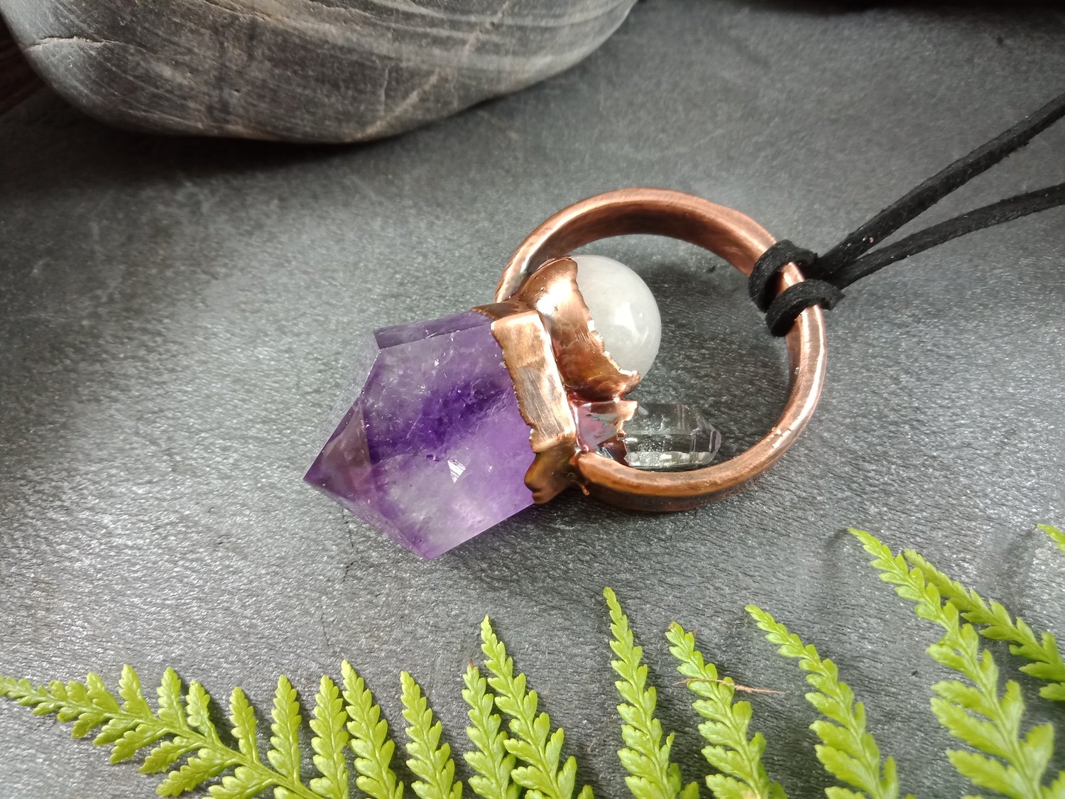 Amethyst, Rose Quartz & Clear Quartz Pendant – Antique Nickel (60mm)