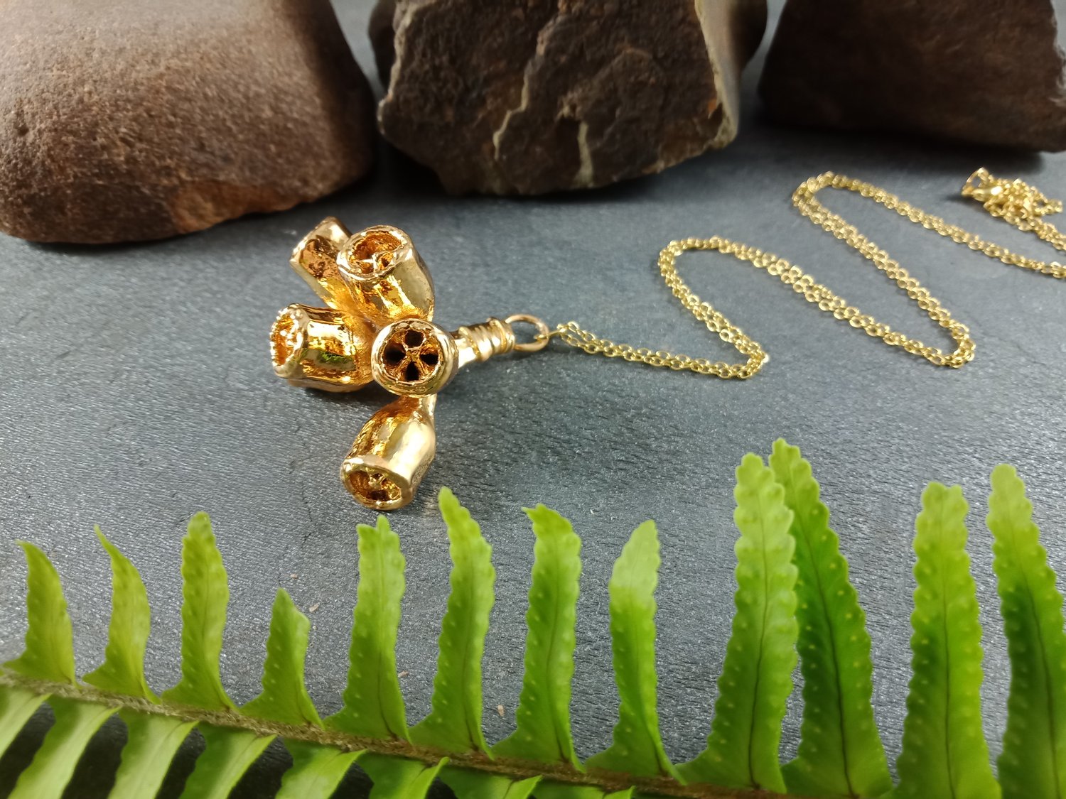 A one-of-a-kind creation, this pendant transforms a real natural gum nut cluster into timeless wearable art.