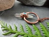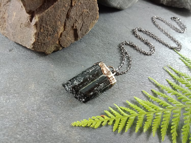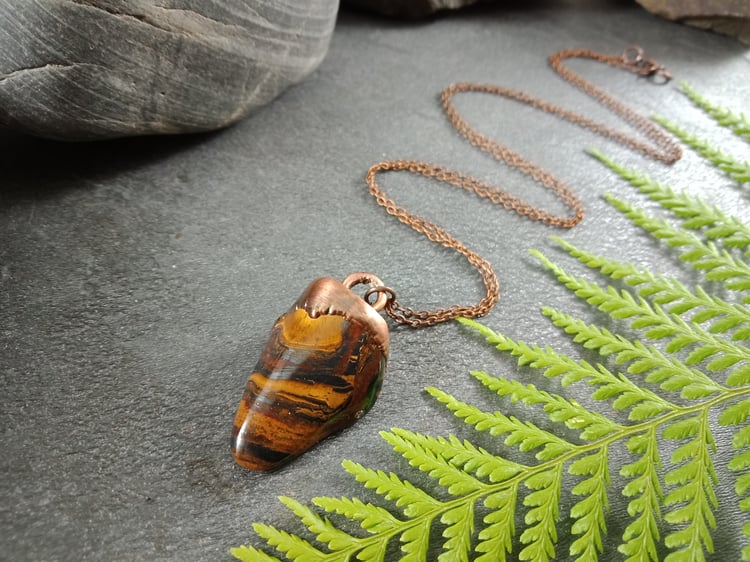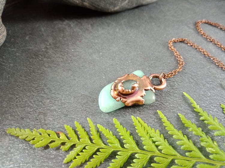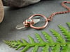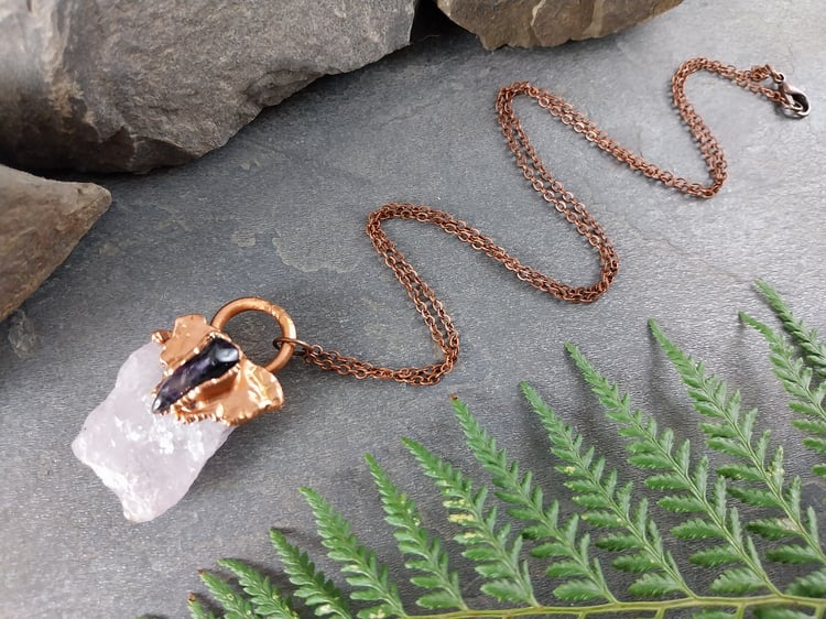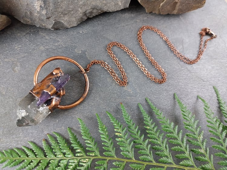 Electroformed in an antique copper finish, the pendant carries a warm, earthy patina that enhances the natural textures and brilliance of the stones. At 42mm, it is perfectly sized for everyday wear—elegant, distinctive, and full of natural charm.