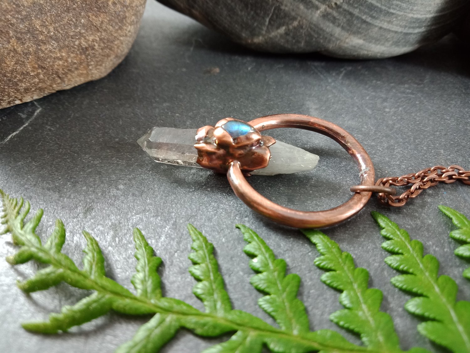 Clear Quartz & Labradorite Pendant – Antique Copper (42mm)