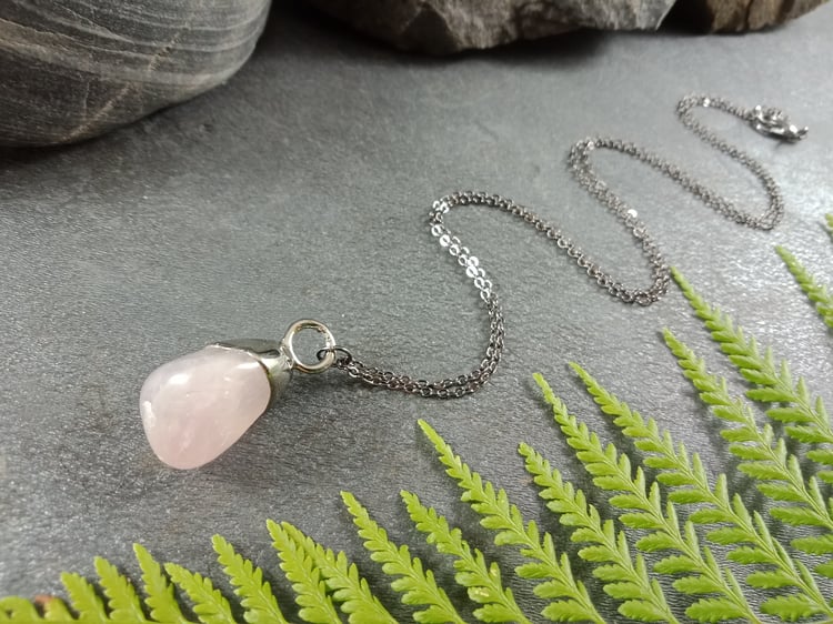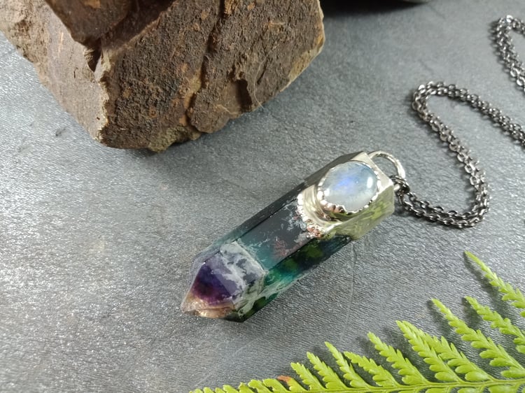 This handcrafted Clear Quartz & Labradorite Pendant highlights the natural beauty of gemstones in a timeless design. A genuine clear quartz crystal point forms the centerpiece, paired with a luminous oval labradorite cabochon that flashes with subtle blue and green iridescence.
