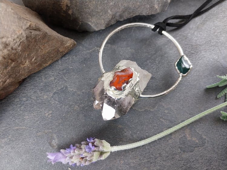 A one-of-a-kind creation, this pendant transforms the raw beauty of earth’s crystals into wearable art.
