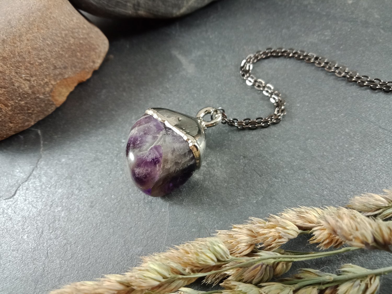 This handcrafted pendant features a beautiful tumbled amethyst chevron dream stone, preserved forever through electroforming in a brilliant bright nickel finish. The soft purple hues and natural banding of the amethyst are highlighted by the metallic sheen, creating a striking and harmonious design.