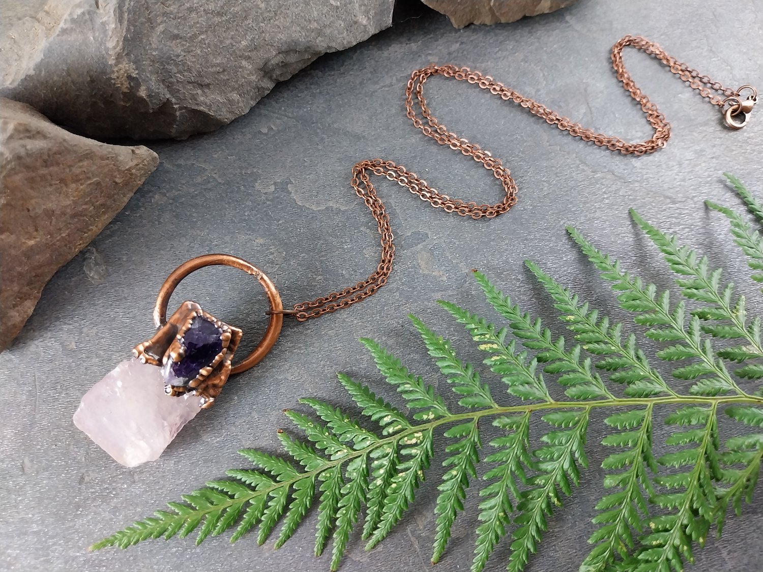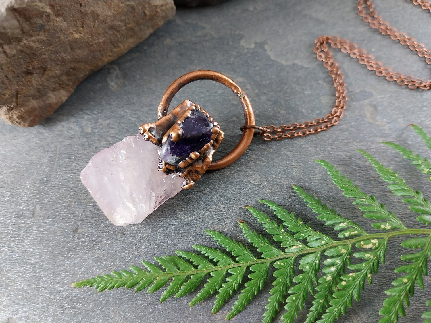 Rose Quartz & Amethyst Pendant – Antique Copper (46mm)