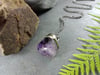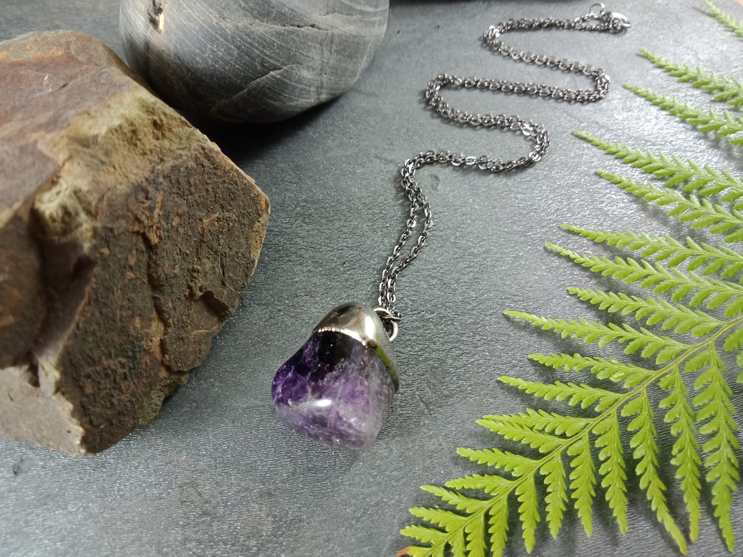 This handcrafted pendant features a gorgeous tumbled chevron dream amethyst crystal, preserved forever through the art of electroforming. The stone’s natural banded patterns of deep violet and soft white create a calming yet striking visual contrast.