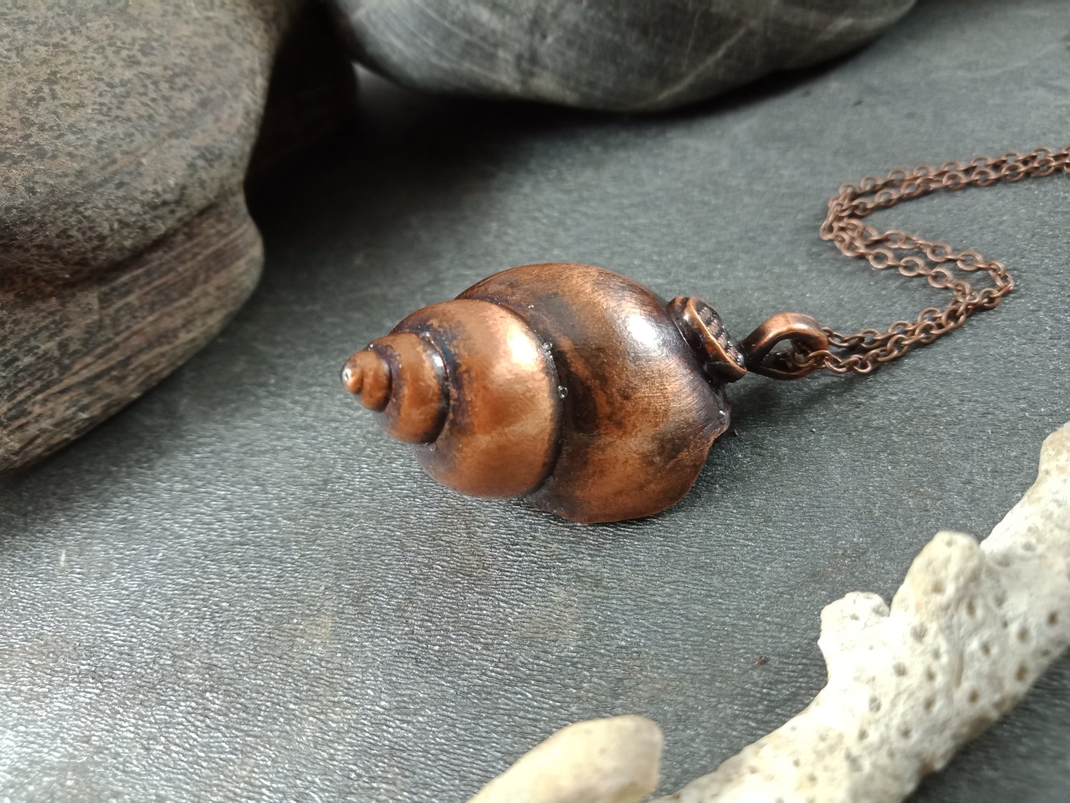 Finished in rustic antique copper, the pendant carries a warm, earthy patina that enhances the natural beauty of the shell. At 30mm, it is a petite yet striking piece—perfect for everyday wear or as a distinctive nature-inspired gift.