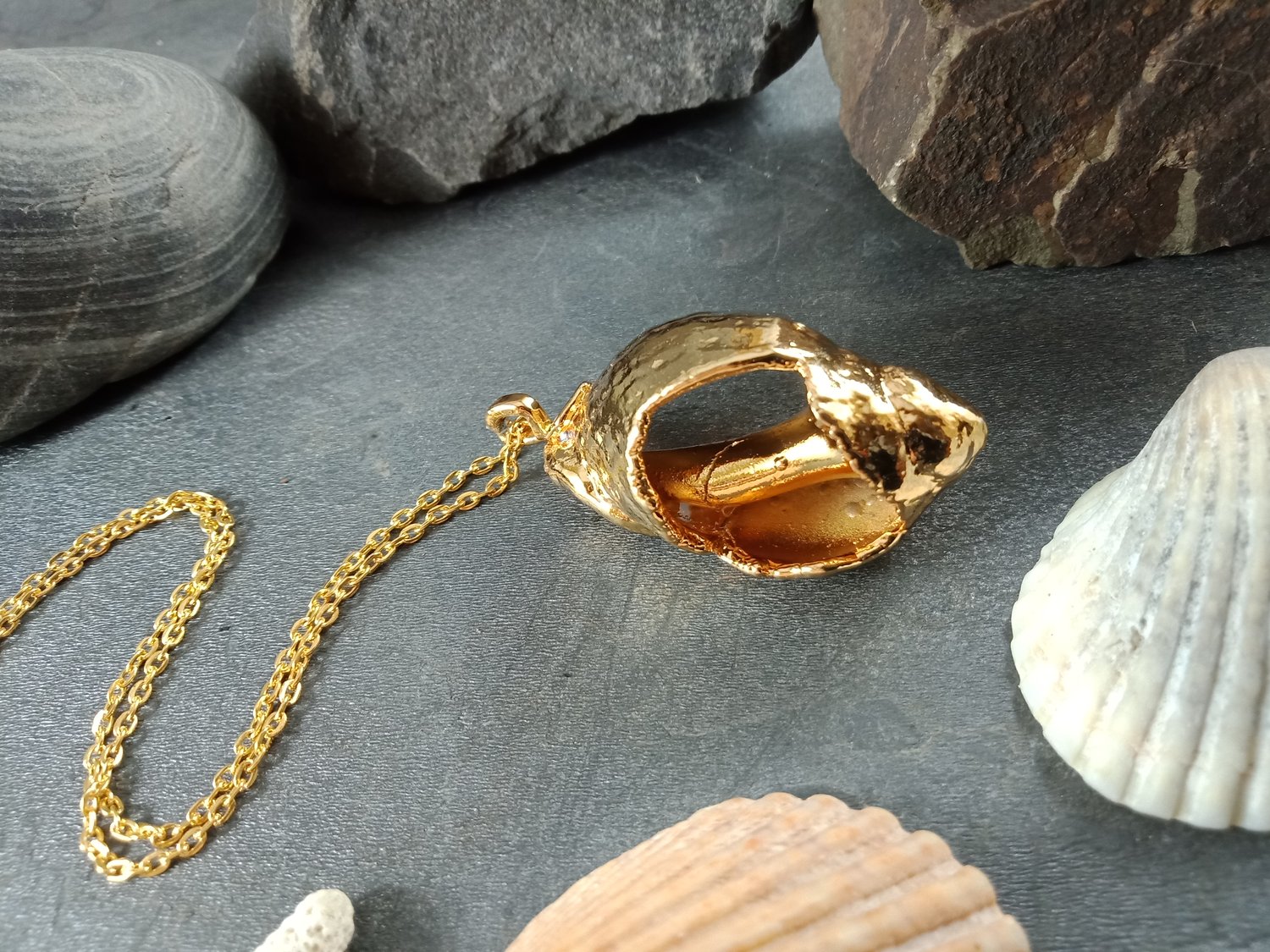 Finished in radiant gold, the pendant gleams with warmth and elegance, highlighting the natural beauty of the shell. At 48mm, it is a striking yet wearable piece—perfect for everyday wear or as a distinctive nature-inspired gift.