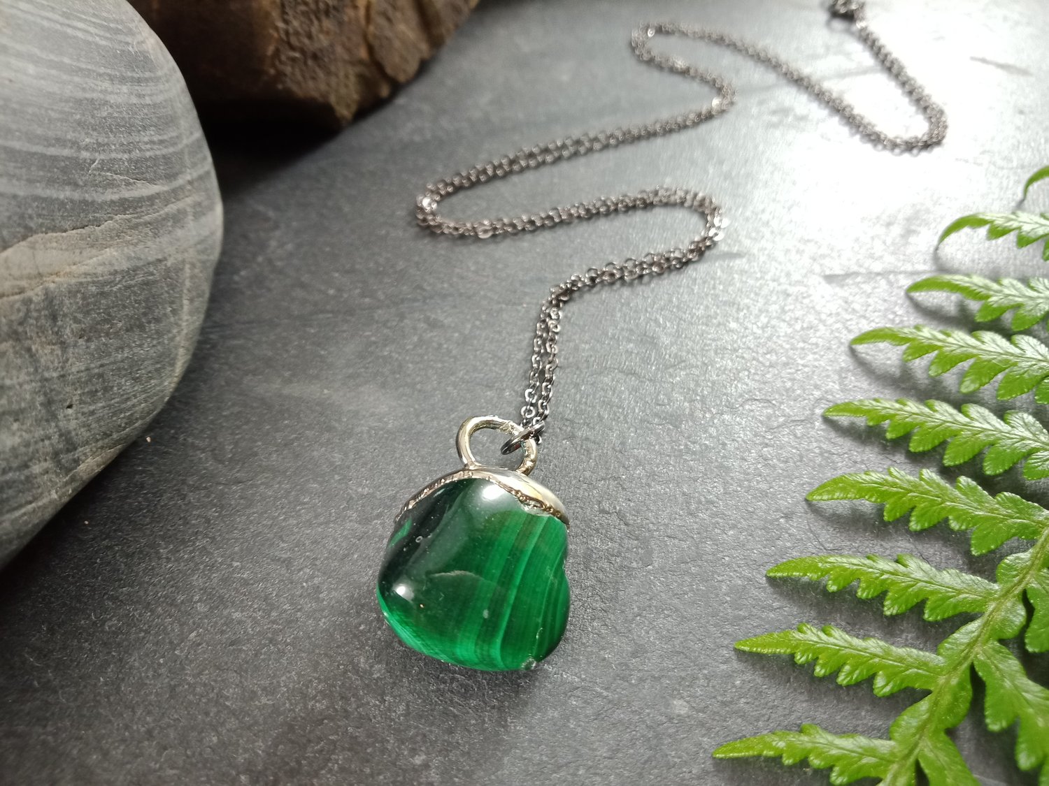 This handcrafted pendant features a gorgeous tumbled malachite crystal, preserved forever through the art of electroforming. The stone’s rich green banding and natural patterns make it a striking centerpiece, each one-of-a-kind in its unique character.