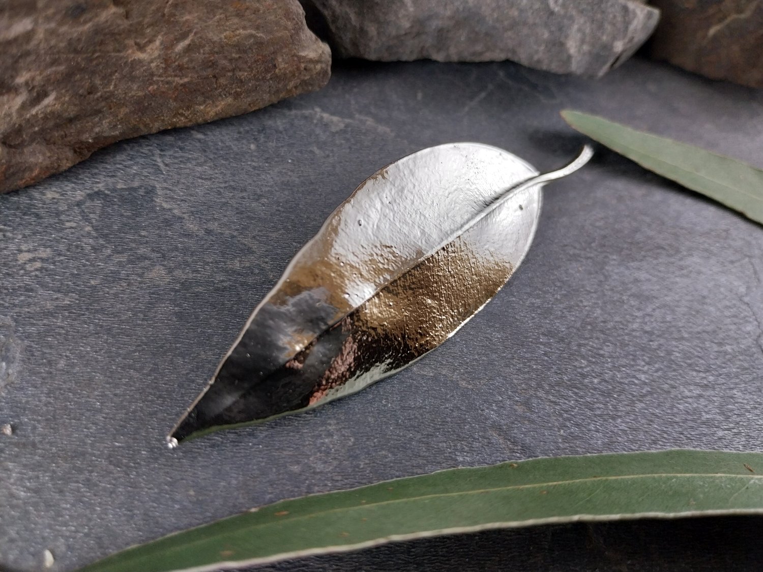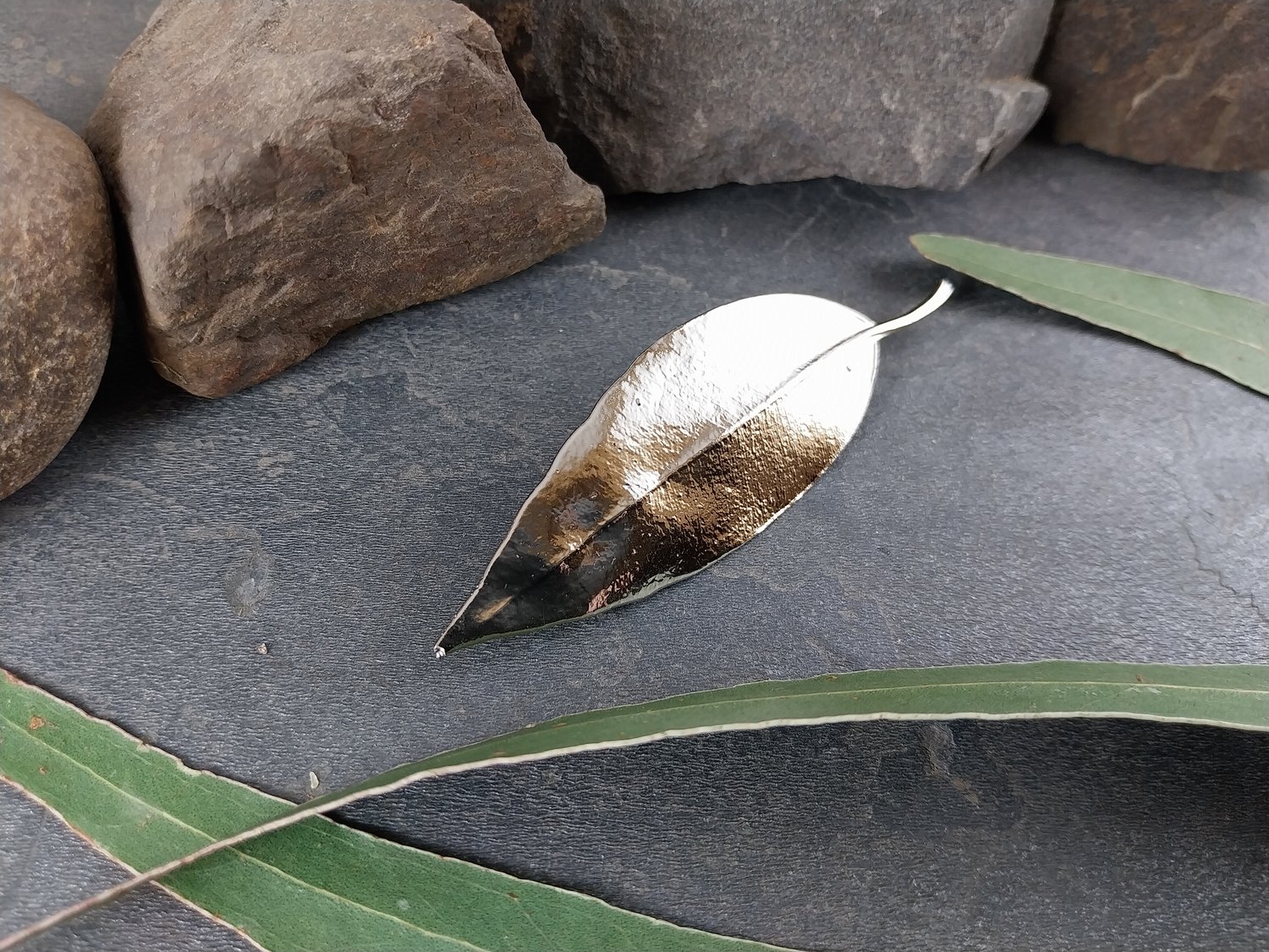 This handcrafted brooch features a real natural gum leaf preserved forever through the art of electroforming. The bright nickel finish beautifully highlights the delicate textures and natural veins of the leaf, giving it a sleek, luminous appearance.