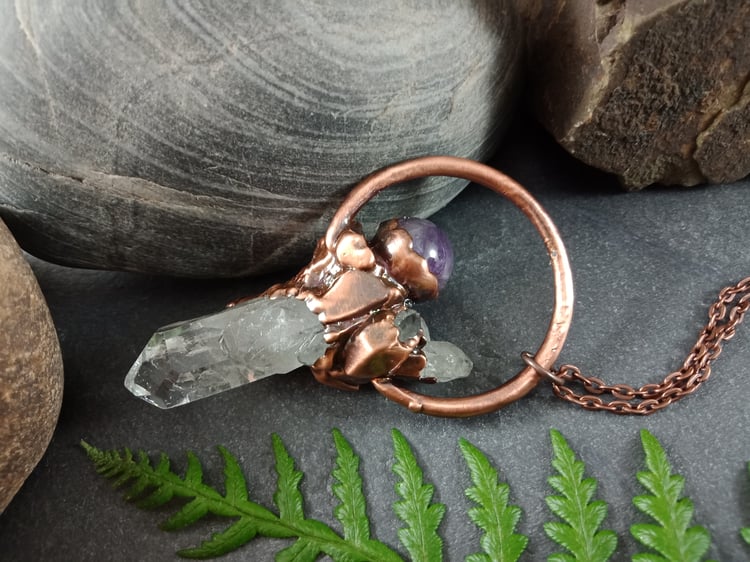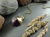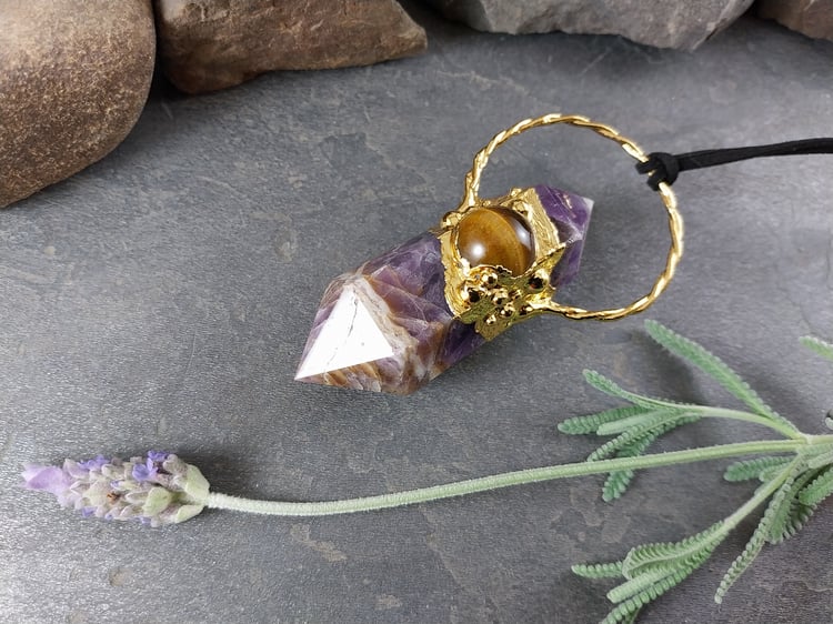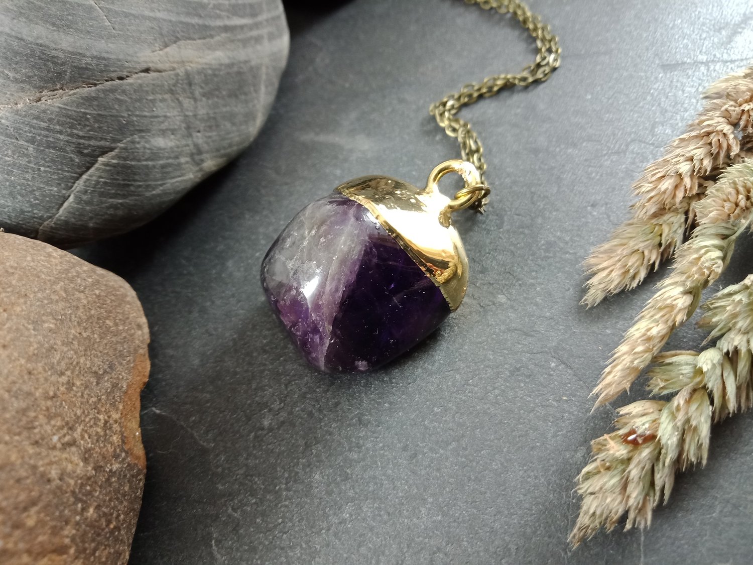 This handcrafted pendant features a stunning tumbled amethyst chevron dream crystal, preserved forever through electroforming in a radiant bright brass finish. The rich purple tones and natural banding of the amethyst are beautifully highlighted by the warm metallic sheen, creating a captivating and harmonious design.