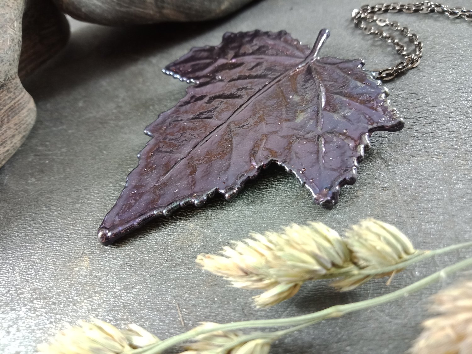 Finished in a unique purple nickel patina, the pendant shimmers with rich, iridescent tones that highlight the natural beauty of the leaf. At 63mm, it is a graceful yet eye-catching piece—perfect for everyday wear or as a distinctive gift.