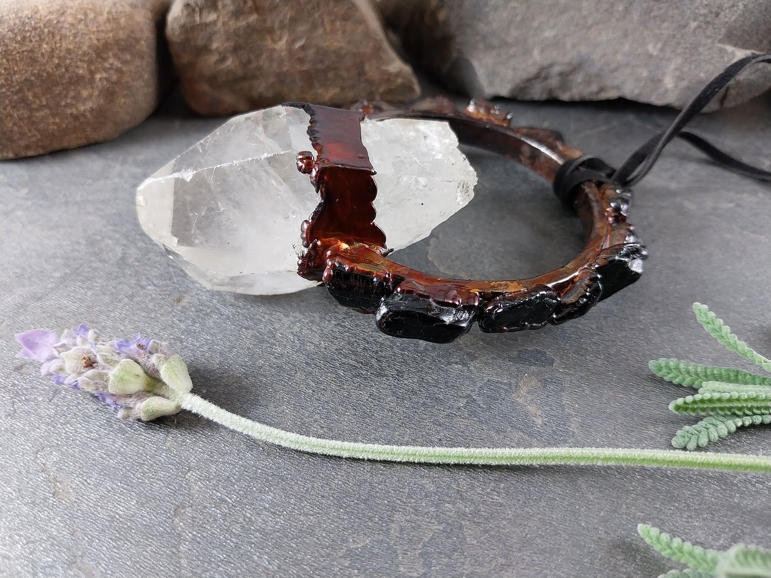 Finished in a vibrant rainbow copper patina, the pendant shimmers with iridescent tones that complement the natural contrast of quartz and obsidian. At 92mm, it is a dramatic statement piece—perfect for those who love jewellery that celebrates nature’s raw power and beauty.