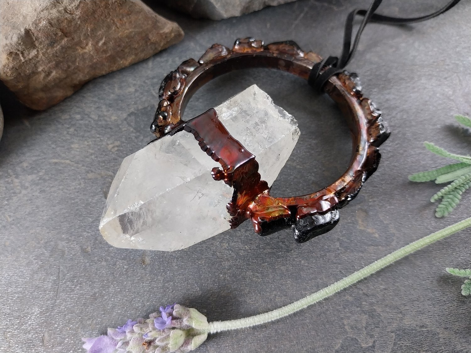 Large Clear Quartz Point Pendant with Obsidian Accents – Rainbow Copper Patina (92mm)