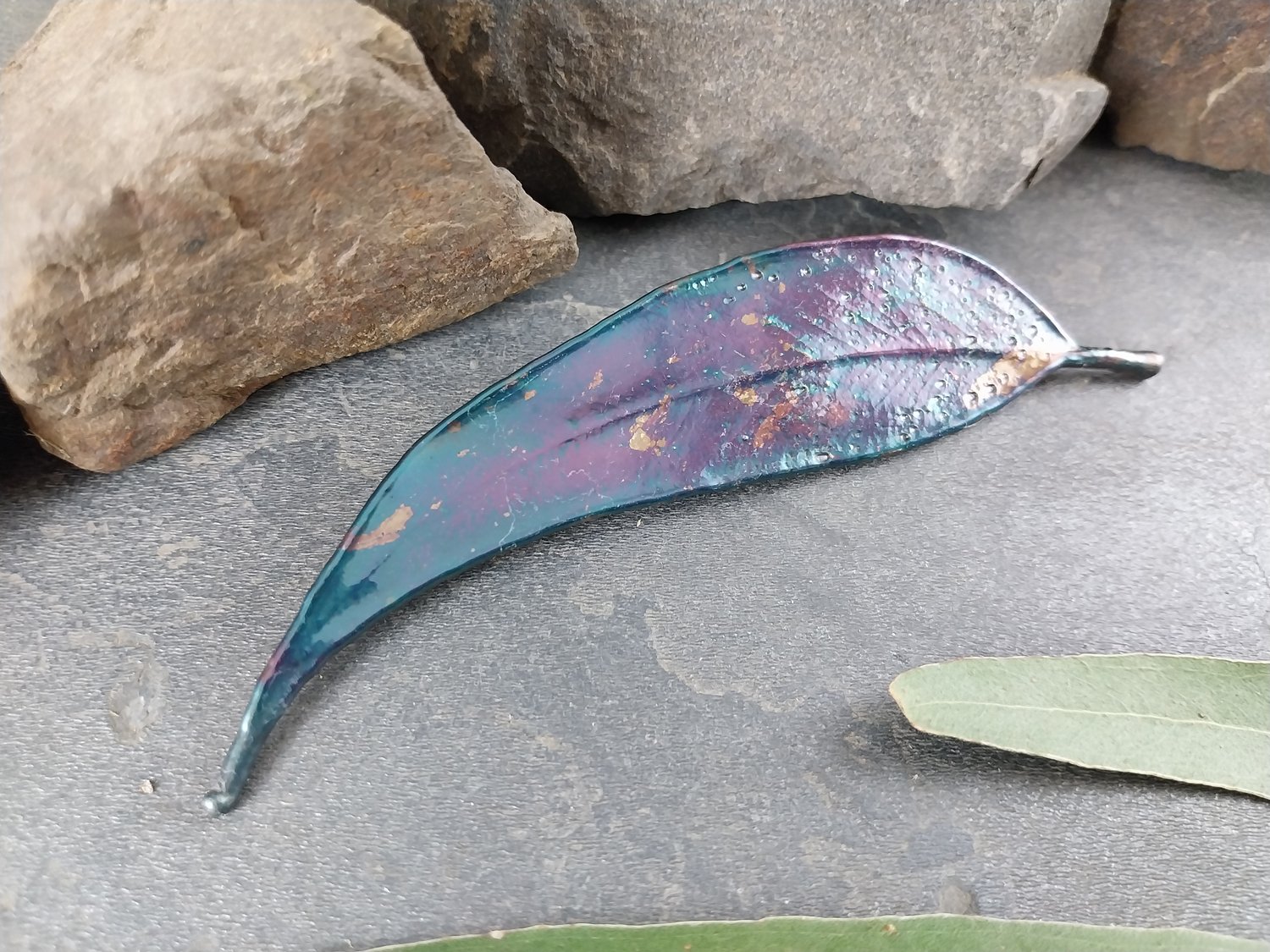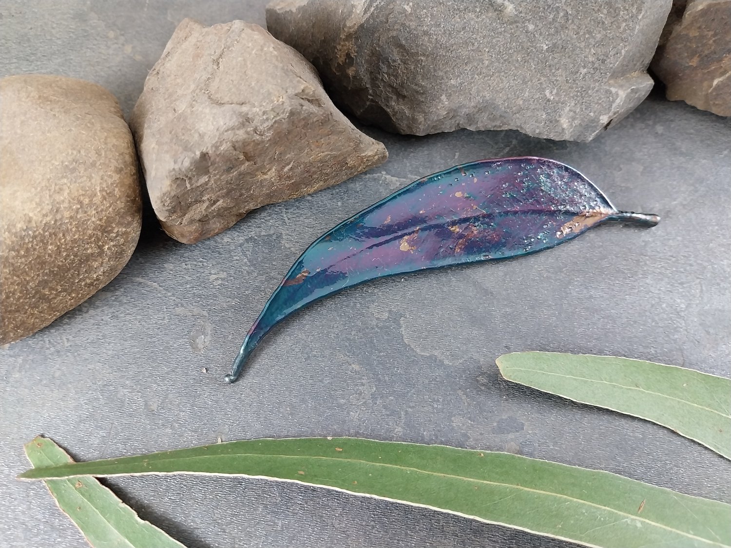 Gum Leaf Brooch – Blue Purple Silver Patina (117mm)