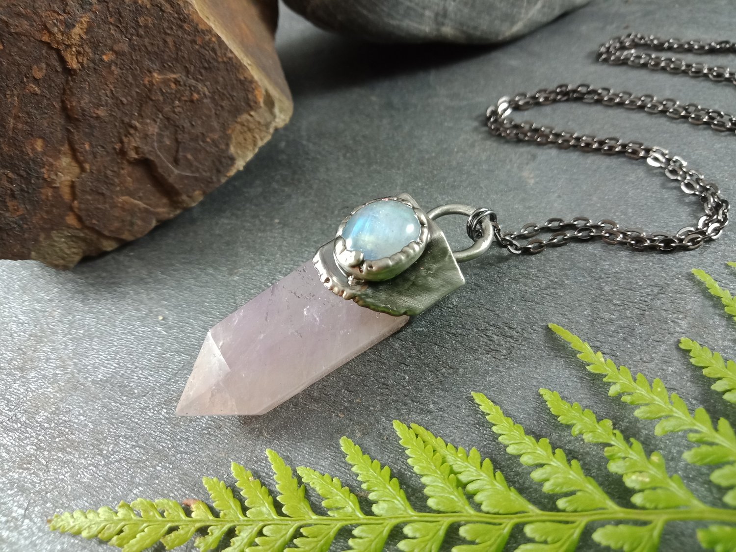 This handcrafted Amethyst & Moonstone Pendant combines the raw beauty of natural crystal with timeless design. A genuine amethyst crystal point forms the centerpiece, paired with a glowing blue fire moonstone cabochon that shimmers with subtle flashes of colour.
