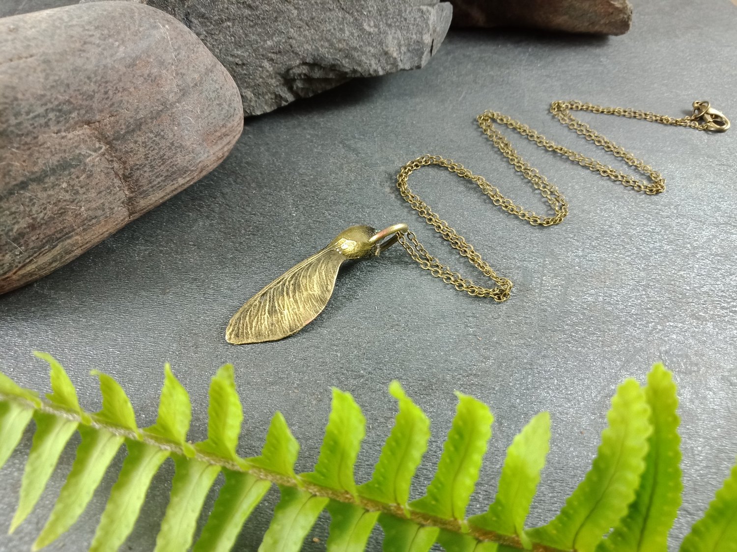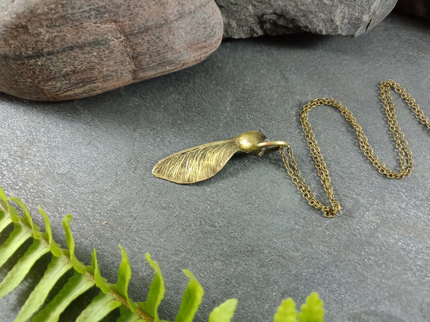 A one-of-a-kind creation, this pendant transforms a real maple seed into timeless wearable art.