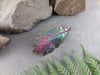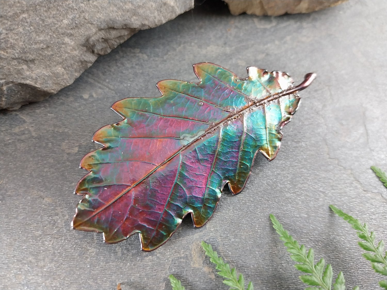 Finished in a vibrant rainbow copper patina, the brooch shimmers with rich, iridescent tones that highlight the natural beauty of the leaf. At 78mm, it is a striking statement piece—lightweight, unique, and easy to wear.