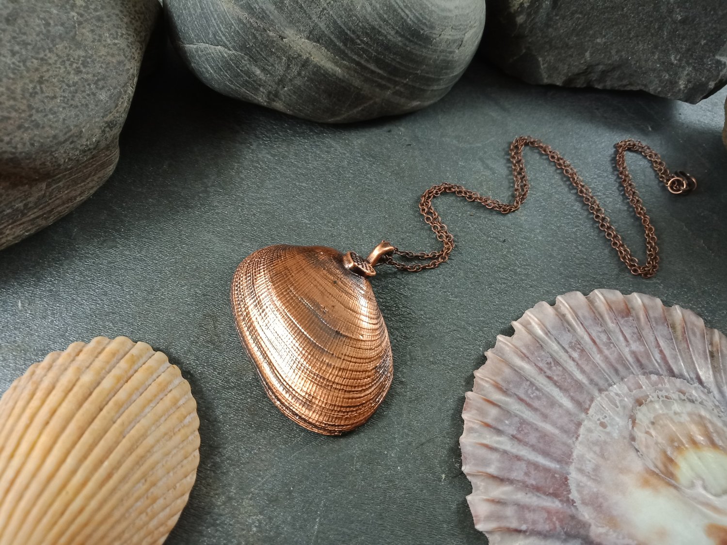 Finished in rustic antique copper, the pendant carries a warm, earthy patina that enhances the natural beauty of the shell. At 48mm, it is a striking yet wearable piece—perfect for everyday wear or as a distinctive nature-inspired gift.