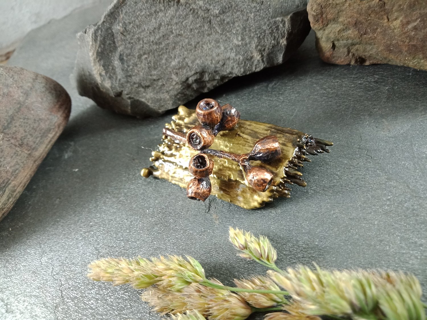 Gum Nut Cluster & Bark Brooch – Antique Copper / Antique Brass (45mm)