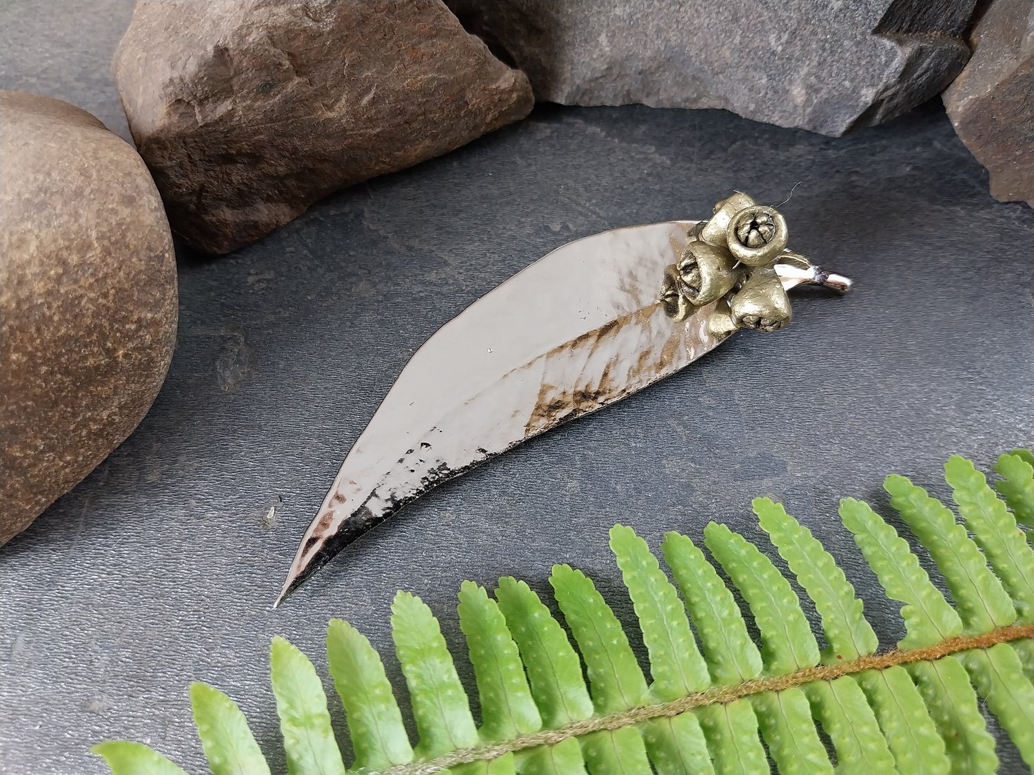 This beautiful brooch features a real natural gum leaf paired with a gum nut, preserved forever through the art of electroforming. The intricate textures of the leaf and the natural form of the gum nut are captured in exquisite detail, showcasing the beauty of nature in wearable form.