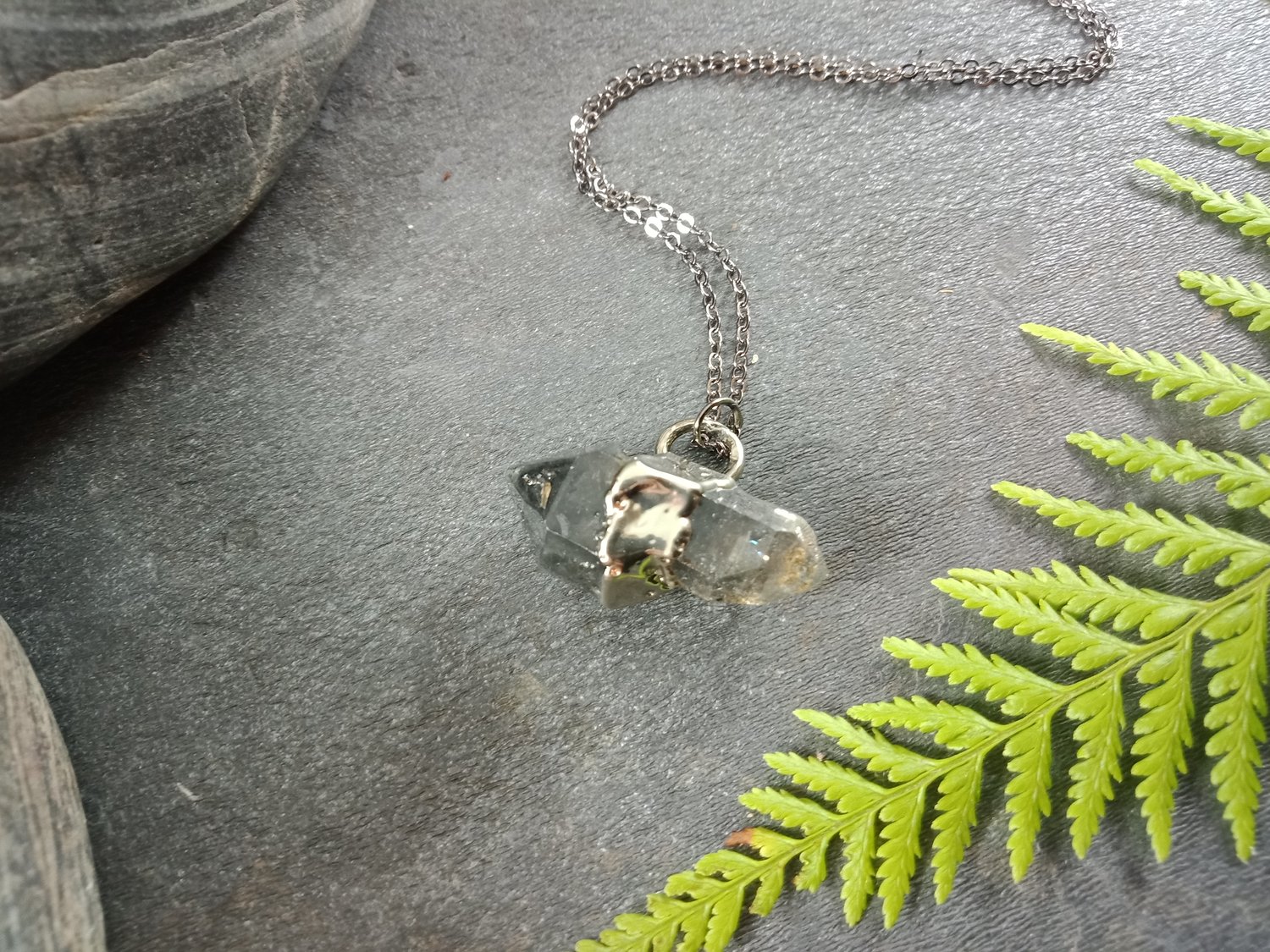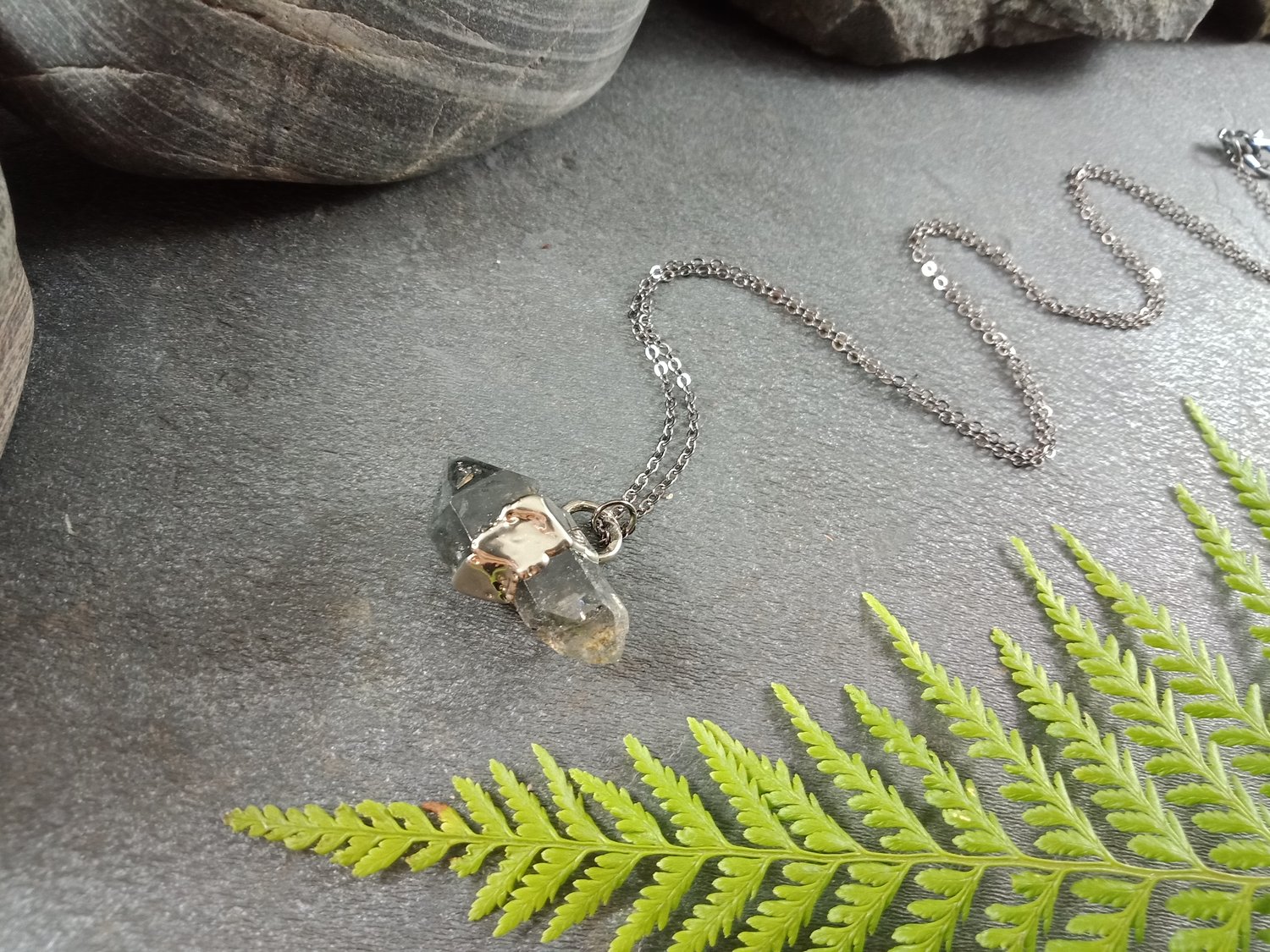 This handcrafted pendant features a striking Tibetan black phantom quartz crystal, preserved forever through the art of electroforming. Known for its unique shadow-like inclusions, phantom quartz is often associated with growth, transformation, and spiritual insight, making it a powerful and meaningful piece to wear.