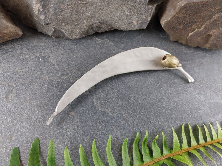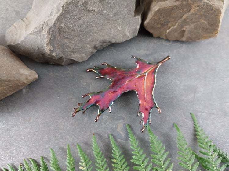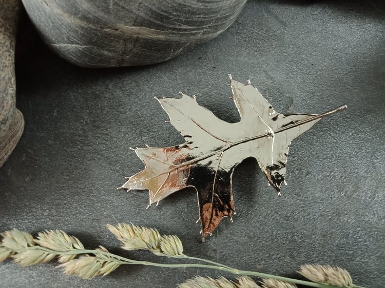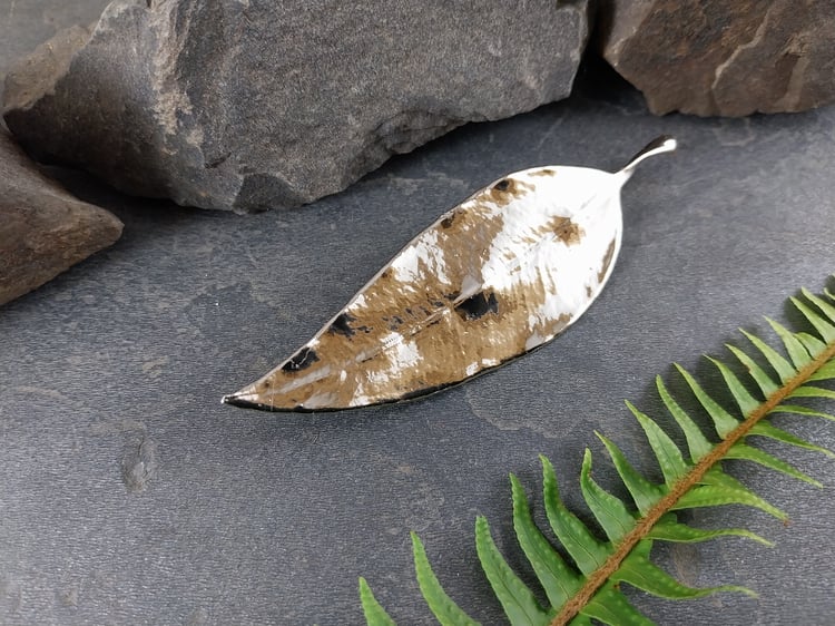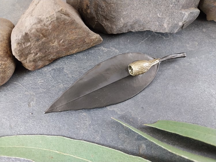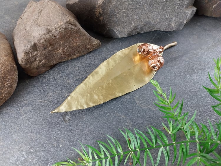 This beautiful brooch features a real natural gum leaf with gum nut accents, preserved forever through the art of electroforming. The delicate textures and organic details of the leaf and nuts are captured in exquisite detail, celebrating the beauty of the natural world.